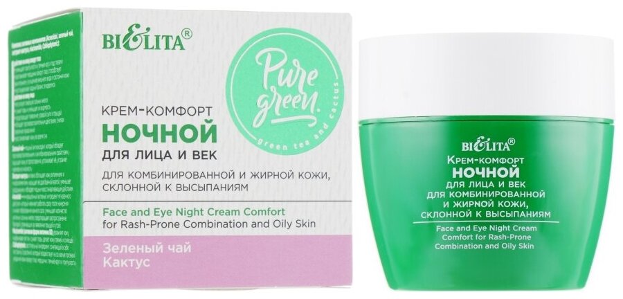 Крем-комфорт Bielita Pure Green обеспечивает проблемной коже бережный и полноценный уход во время ночного отдыха.Комплекс активных компонентов (Acnacidol, зеленый чай, экстракт кактуса,niacinamide,Cobiophytonic):действие на кожу вокруг глазуменьшает припухлости и темные круги под глазамиразглаживает морщинки вокруг глаз, способствует значительному улучшению внешнего вида и состояния коживосстанавливает водный баланс эпидермисадействие на кожу лицарегулирует секрецию сальных железсужает поры и уменьшает их видимостьпредотвращает появление прыщейобладает противовоспалительным действием, снимая появление покрасненийвосстанавливает кожу во время снаЗеленый чай- мощный антиоксидант, который обладает противовоспалительными и антибактериальными свойствами, защищает кожу от фотостарения, успокаивает её, устраняет чрезмерную жирность.Экстракт кактуса активно обогащает кожу витаминами и микроэлементами, насыщает её драгоценной влагой, уменьшает раздражение и обладает мощным восстанавливающим действием.Acnacidol -инновационный активный ингредиент мгновенного действия, который начинает работать сразу после нанесения - снижает образование кожного сала, уменьшает количество активных сальных желез, предотвращает распространение бактерий, отвечающих за появление прыщей и угрей.Niacinamide(активная форма витамина В3) увлажняет кожу, выравнивает её тон, сужает поры, делает кожу свежей и сияющей.Cobiophytonic растительный ингредиент, сочетающий в себе экстракты 5 растений, который воздействует на основные признаки увядания кожи вокруг глаз: морщинки, темные круги и припухлости. В результате взгляд становится отдохнувшим, ярким и сияющим.