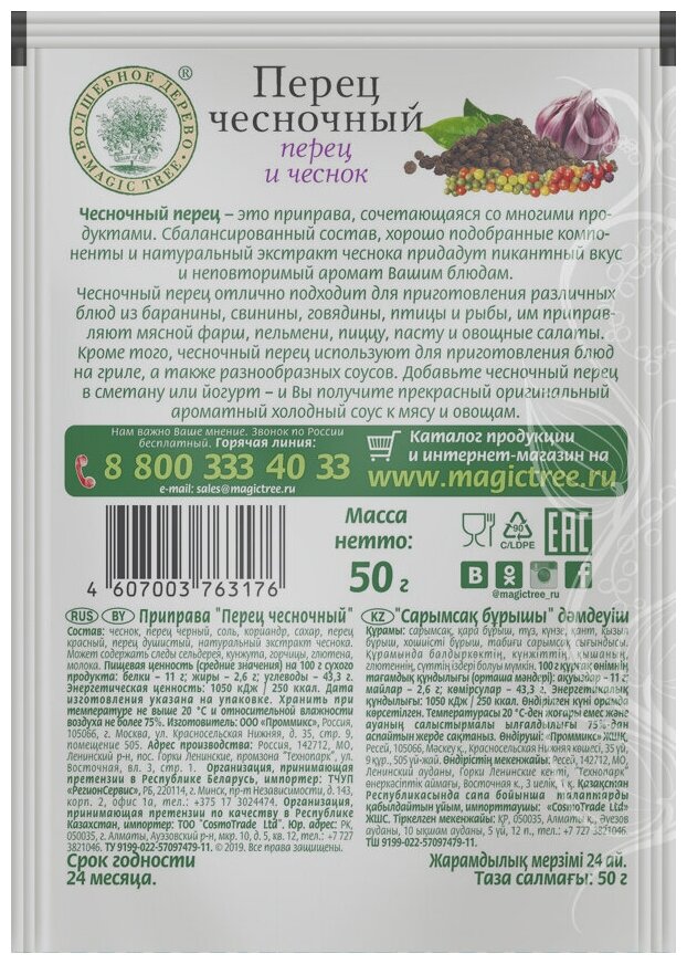 | Состав | чеснок; перец черный; соль; кориандр; сахар; перец красный; перец душистый; экстракт чеснока натуральный |