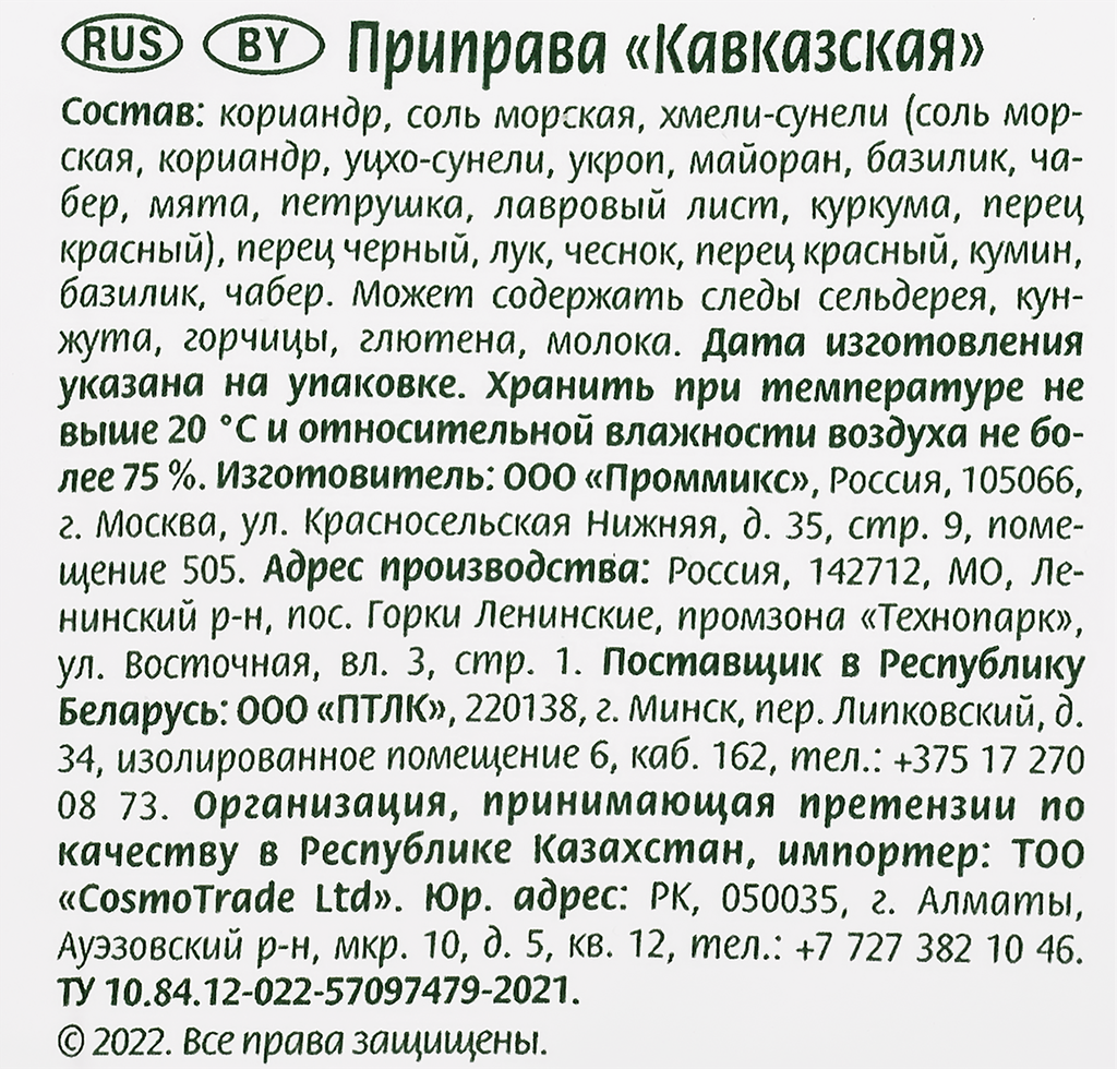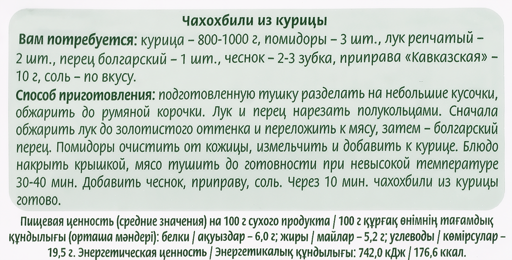 | Состав | кориандр; соль морская; хмели-сунели; перец черный; лук; чеснок; перец красный; кумин; базилик; чабер |