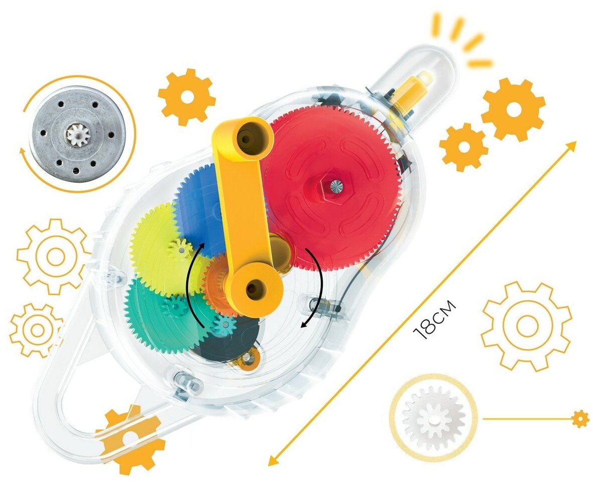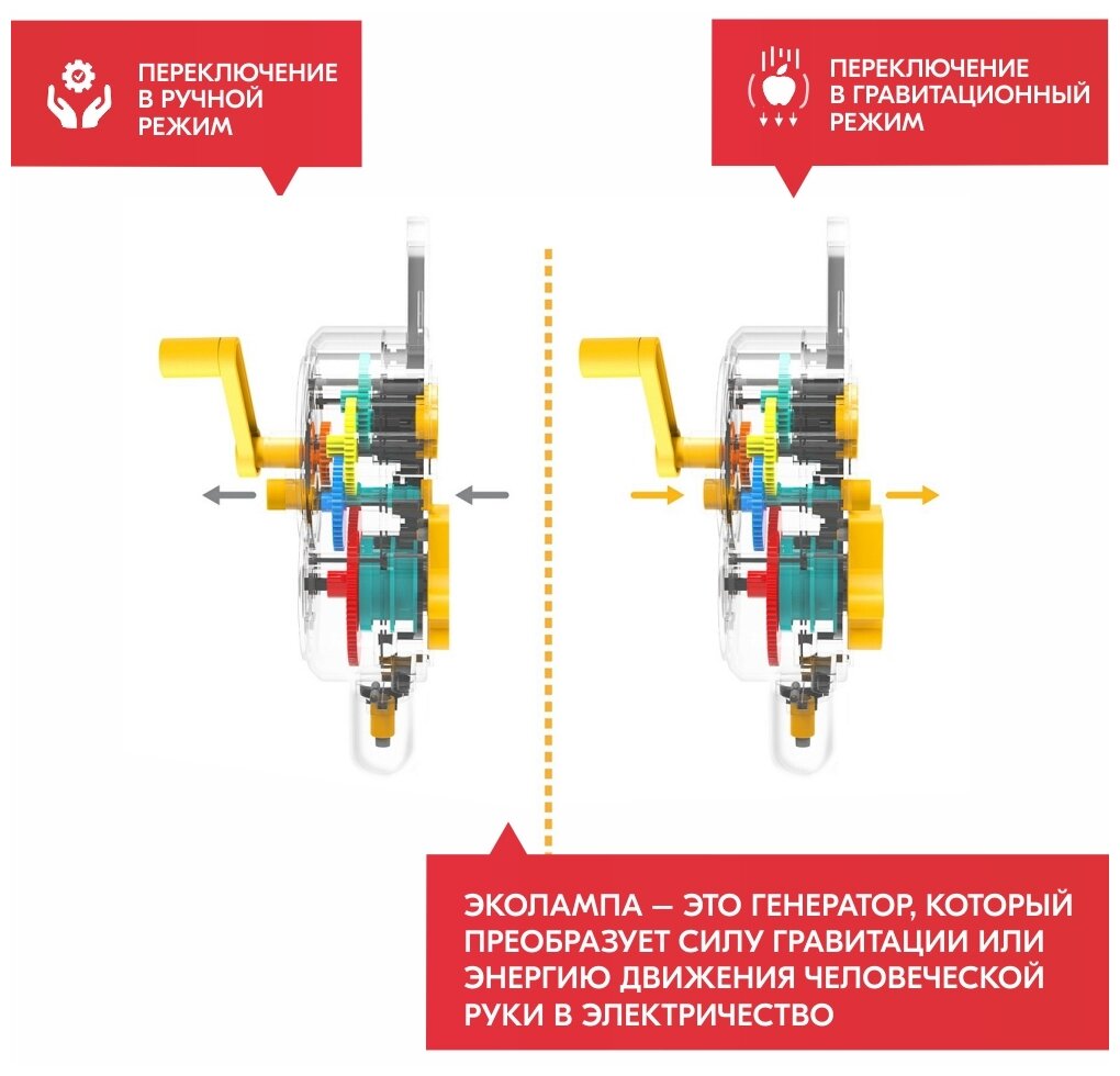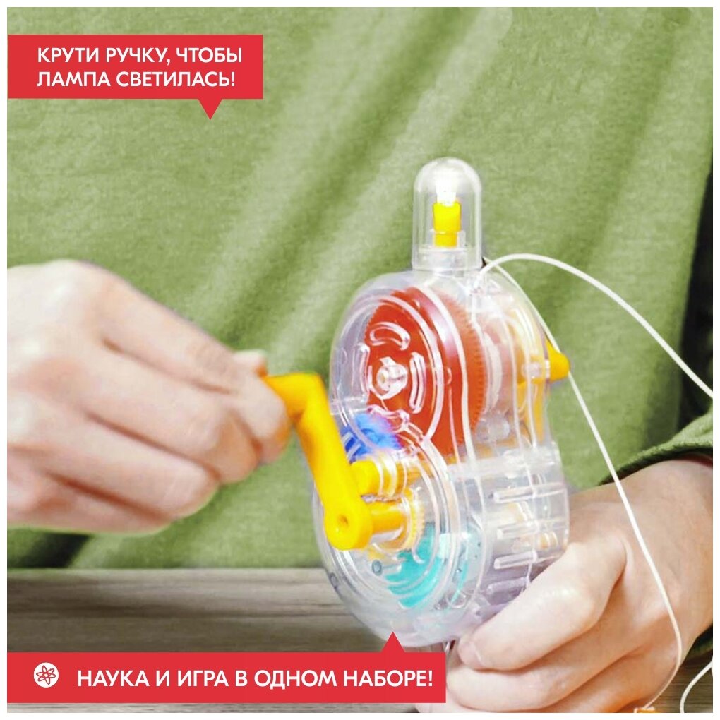 В игрушечном моторе, который используется в этом наборе, провод накручен на центральную ось. В корпусе мотора закреплены магниты. Когда блок или ручка поворачиваются, центральная ось вращается с помощью магнитов и создается электрический ток, достаточно сильный, чтобы включить светодиодную лампу.