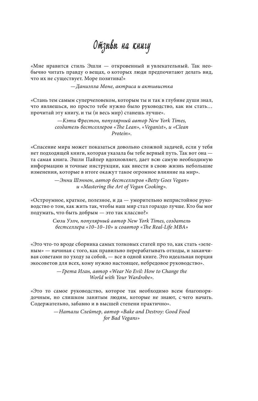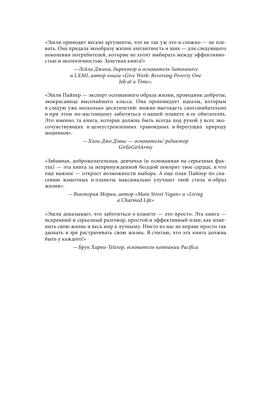 ?Это первое руководство по переходу к более доброй, здоровой, сознательной и устойчивой жизни без купюр. Эшли Пайпер, популярный журналист, эксперт по экологичному образу жизни, проведет вас через простые, но впечатляющие изменения в образе жизни. Каждый может жить и становиться лучше день за днем, в доме (на кухне, в гардеробе, в уходе за собой) и снаружи (в общественной жизни, на работе, за границей). Пришло время меняться. На этот раз точно!