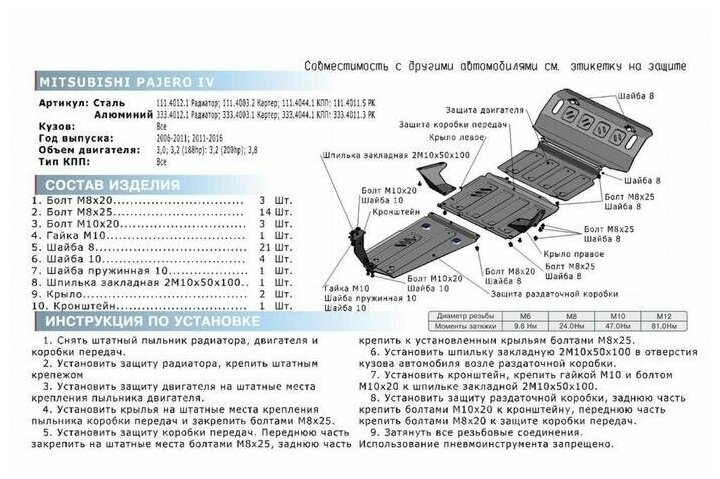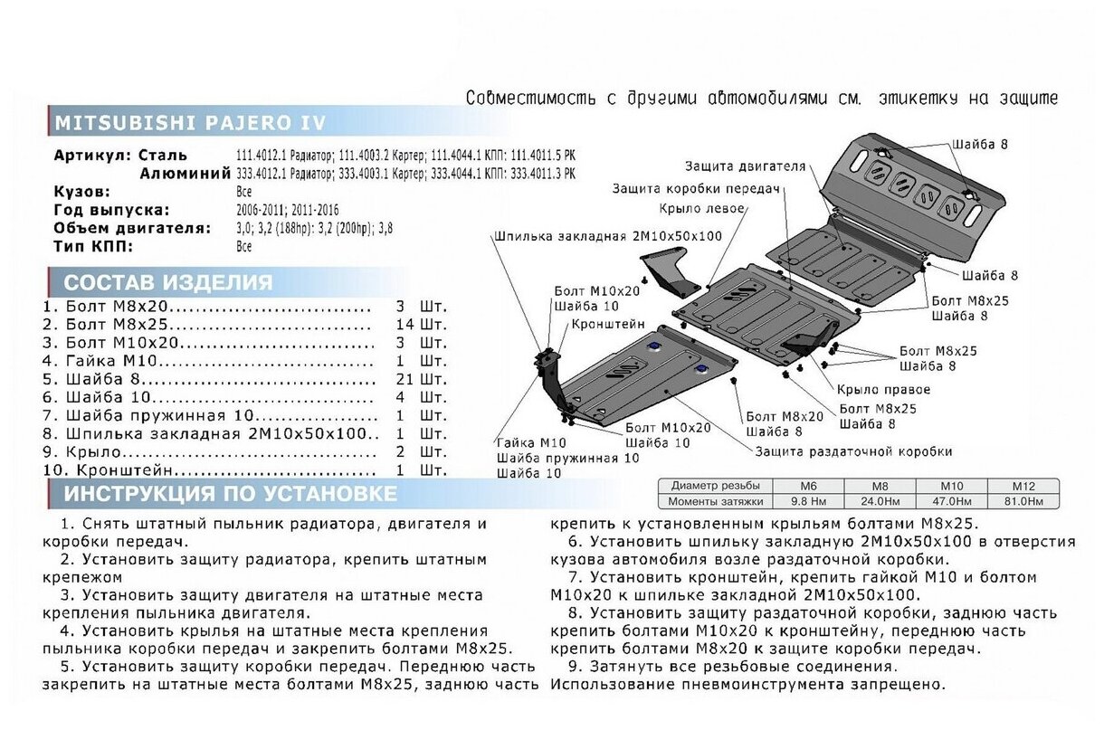 Защита КПП Rival подходит для:Mitsubishi Pajero III (V - все) 1999-2006Mitsubishi Pajero IV (V - 3.0; 3.2D (188/200 л. с.); 3.8) 2006-2020Защищаемый агрегат - КПП.Бренд - Rival.Страна - Россия.Наличие крепежа - в комплекте.Материал - алюминий 4 мм.Цвет - серый.Упаковка - термоусадочная пленка.Листов (частей) - 1.Штамповка - есть.Артикул - Алюминиевые защиты Rival надежно защищают днище вашего автомобиля от повреждений, например при наезде на бордюры, а также выполняют эстетическую функцию при установке на высокие автомобили.- Толщина алюминиевых защит в 2 раза толще стальных, а вес при этом меньше до 30%.- Отлично отводит тепло от двигателя своей поверхностью, что спасает двигатель от перегрева в летний период или при высоких нагрузках.- В отличие от стальных, алюминиевые защиты не поддаются коррозии, что гарантирует срок службы защит более 5 лет.- Покрываются порошковой краской, что надолго сохраняет первоначальный вид новой защиты и защищает от гальванической коррозии.- Подштамповка в местах крепления защищает крепеж от срезания.- Помимо основной функции защиты от удара, конструкция так же существенно снижает попадание в моторный отсек влаги и грязи.- В комплекте инструкция по установке.