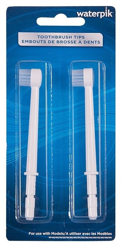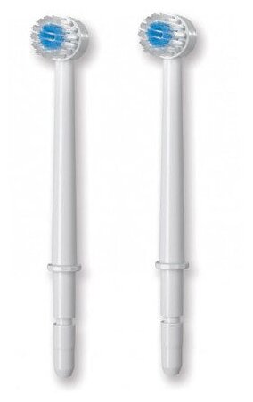 Насадка имеет форму зубной щётки, помогает очистить поверхность зубов при помощи щетины и подающейся через микроотвесртие жидкости. Вы можете использовать зубную пасту или жидкость для ирригатора. Данные насадки подходят ко всем ирригатарам waterpik кроме модели Waterpik WP-70. Рекомендуется замена каждые 3 месяца.