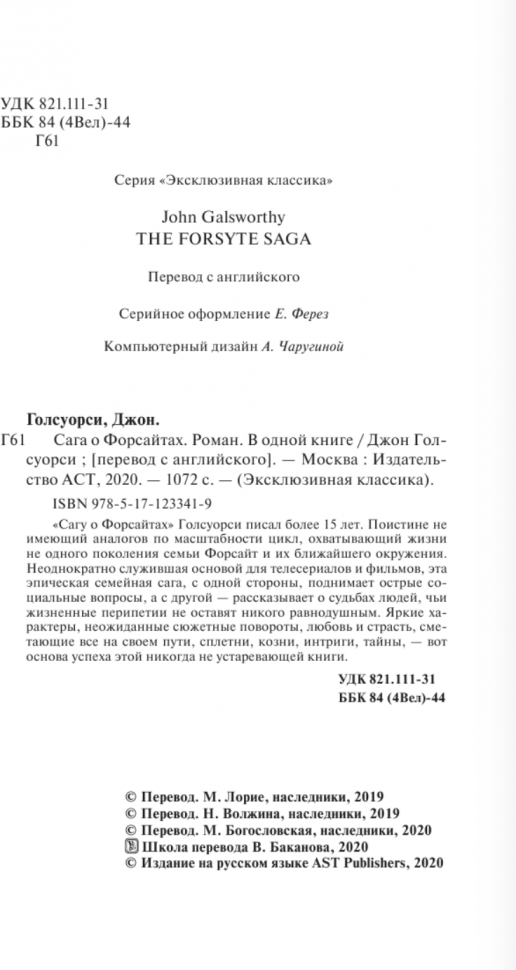 "Сагу о Форсайтах" Голсуорси писал более 15 лет. Поистине не имеющий аналогов по масштабности цикл, охватывающий жизни не одного поколения семьи Форсайт и их ближайшего окружения. Неоднократно служившая основой для телесериалов и фильмов, эта эпическая семейная сага, с одной стороны, поднимает острые социальные вопросы, а с другой — рассказывает о судьбах людей, чьи жизненные перепитии не оставят никого равнодушным. Яркие характеры, неожиданные сюжетные повороты, любовь и страсть, сметающие все на своем пути, сплетни, козни, интриги, тайны, — вот основа успеха этой никогда не устаревающей книги.