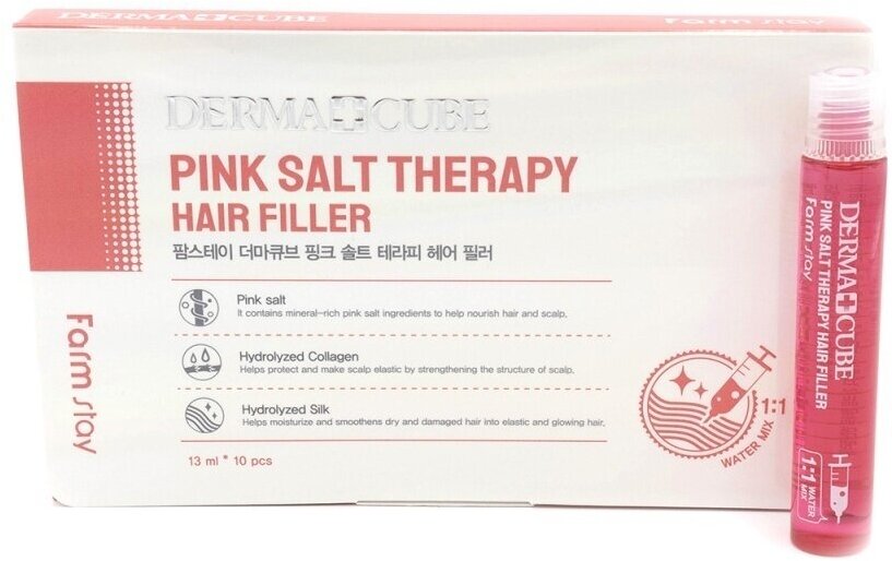 Укрепляющий филлер с розовой солью укрепляет волосы, предотвращает их выпадение, борется с перхотью и придает волосам живость и блеск. Розовая соль насыщает минералами, оказывает бактерицидный и восстанавливающий эффект. Гидролизованный шелк восстанавливает повреждённые волосы, увеличивает толщину волоса, защищает от механических и термических повреждений. Гидролизованный коллаген активно впитывает молекулы воды, поэтому он помогает восстановить гидробаланс волос и кожи головы. Он укрепляет волосы, возвращ