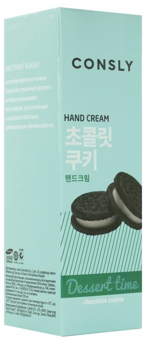 Уход за телом / Уход за рукамиБыстро убирает сухость и стянутость кожи, увлажняет, питает, разглаживает и смягчает еёАктивные вещества: Water, Cetearyl Alcohol, Glycerin, Mineral Oil, Hydrolyzed Collagen, Theobroma Cacao (Cocoa) Extract, Glyceryl Stearate, PEG-100 Stearate, Triethanolamine, Carbomer, Methylparaben, Sorbitan Sesquioleate, Xanthan Gum, Propylparaben, Fragrance.Крем для рук с ароматом шоколадного печенья Dessert Time Chocolate Cookie Hand Cream южнокорейского бренда Consly входит в состав коллекции средств, которые соединяют в себе прекрасные ухаживающие свойства и ароматерапию. Лёгкая консистенция продукта хорошо распределяется на поверхности кожного покрова и быстро впитывается полностью, не оставляет жирных следов и липкой плёнки.Крем быстро убирает сухость и стянутость кожи, увлажняет, питает, разглаживает и смягчает её, успокаивает покраснение, воспаление и шелушение. Продукт делает кожный покров более нежным и шелковистым, предохраняет от негативного воздействия внешних факторов окружающей среды и повышает защитные функции эпидермиса. Средство обладает антиоксидантными свойствами, замедляет процесс старения кожи. Основными действующими ингредиентами формулы выступают гидролизованный коллаген и экстракт какао.