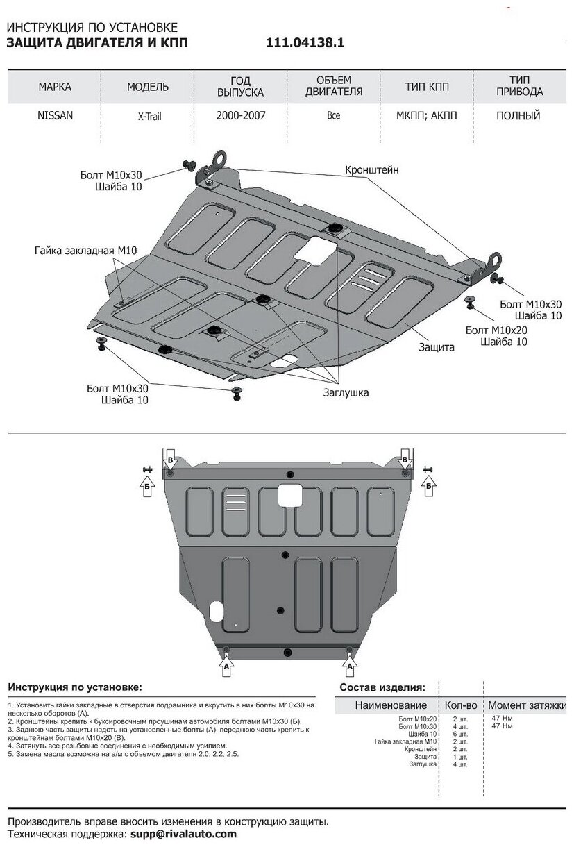 Защита картера и КПП (сталь), АвтоБроня . В комплекте идет - упаковка, защита, крепеж, инструкция Подходит для: Nissan X-Trail (V - все), 2001 - 2007 года выпуска. Стальные защиты Автоброня надежно защищают ваш автомобиль от повреждений при наезде на бордюры, выступающие канализационные люки, кромки поврежденного асфальта или при ремонте дорог, не говоря уже о загородных дорогах. Имеют оптимальное соотношение цена-качество. Спроектированы с учетом особенностей автомобиля, что делает установку удобной. Защита устанавливается в штатные места кузова автомобиля. Является надежной защитой для важных элементов на протяжении долгих лет. Глубокий штамп дополнительно усиливает конструкцию защиты. Подштамповка в местах крепления защищает крепеж от срезания. Технологические отверстия там, где они необходимы для смены масла и слива воды, оборудованные заглушками, закрепленными на защите. Толщина стали 2 мм. На некоторых защитах вырезаны технологические отверстия для замены масла, закрываемые специальными резиновыми заглушками (демпферами). Отсутствие или наличие отверстий зависит от расположения масляного фильтра в конкретной модели автомобиля. Минимальная потеря клиренса. Тем более не у всех автомобилей самая нижняя точка это подрамник, поэтому на некоторых автомобилях защита не влияет на клиренс. Уважаемые клиенты! Обращаем ваше внимание, на тот факт, что защита имеет форму, соответствующую модели данного автомобиля. Наличие глубокого штампа и лючков для смены фильтров/масла предусмотрено не на всех защитах. Фото служит для визуального восприятия товара.