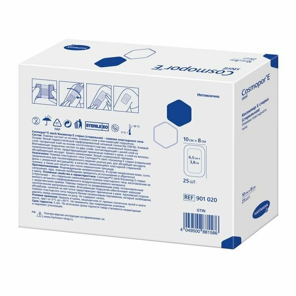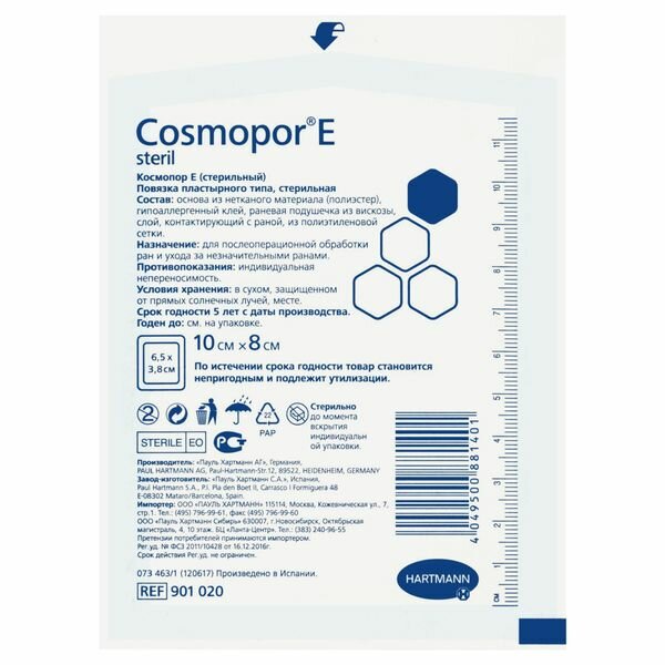 - Самоклеящаяся повязка COSMOPOR E предназначена для ухода за послеоперационными ранами, а также для стерильного ухода при незначительных повреждениях кожи. Это повязка из мягкого нетканого материала со специальной не приклеивающейся к ране впитывающей подушечкой, обладает хорошей сорбционной способностью и защитными свойствами; благоприятна для кожи за счёт гипоаллергенных свойств синтетического каучукового клея.