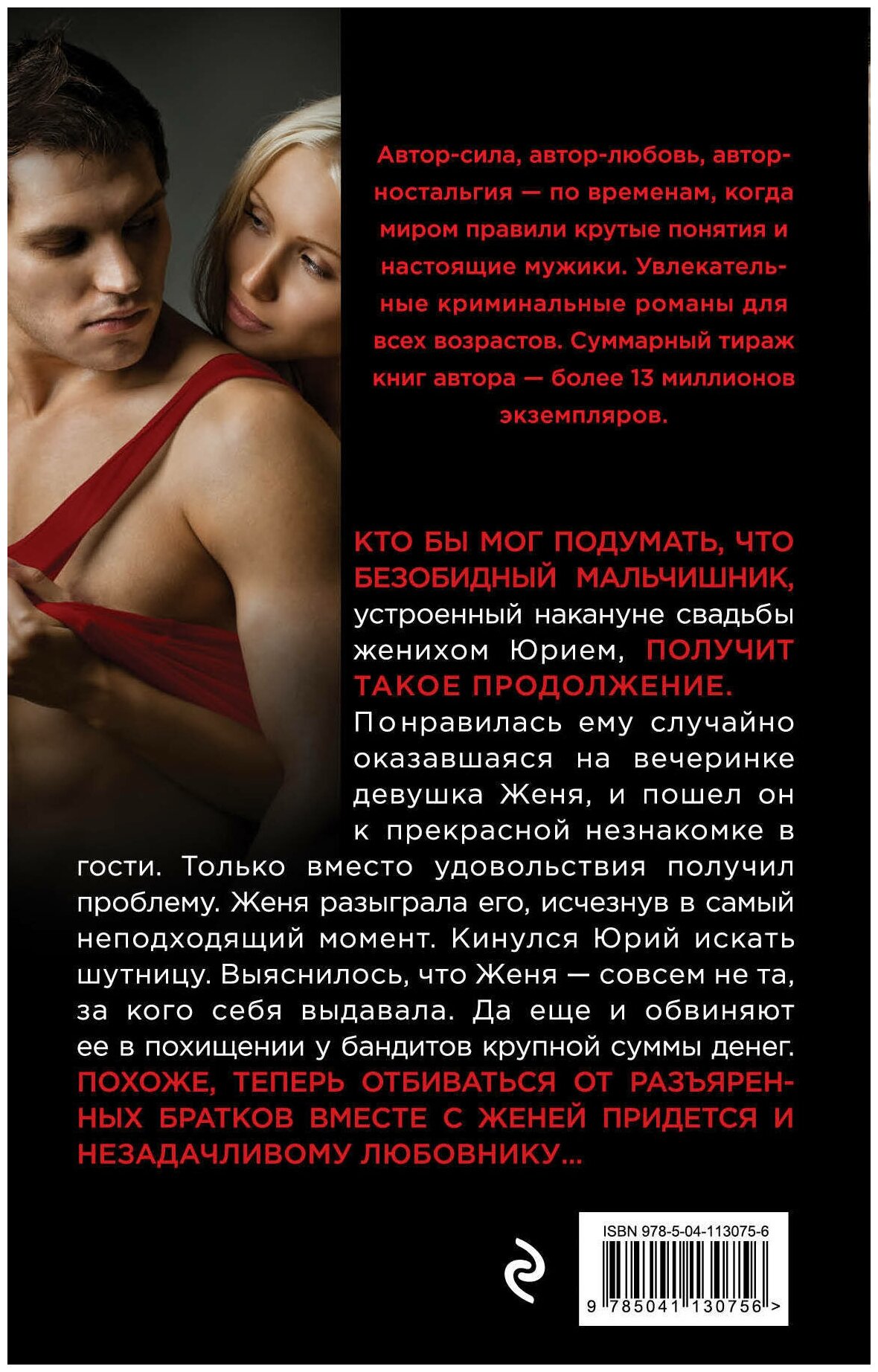 Кто бы мог подумать, что безобидный мальчишник, устроенный накануне свадьбы женихом Юрием, получит такое продолжение. Понравилась ему случайно оказавшаяся на вечеринке девушка Женя, и пошел он к прекрасной незнакомке в гости. Только вместо удовольствия получил проблему. Женя разыграла его, исчезнув в самый неподходящий момент. Кинулся Юрий искать шутницу. Выяснилось, что Женя совсем не та, за кого себя выдавала. Да еще и обвиняют ее в похищении у бандитов крупной суммы денег. Похоже, теперь отбиваться от разъяренных братков вместе с Женей придется и незадачливому любовнику…