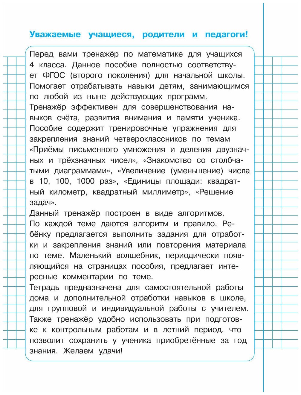 Основная задача пособия, соответствующего ФГОС – проверить уровень знаний и закрепить полученные в школе навыки по основным математическим темам: "Приемы письменного умножения и деления двузначных и трехзначных чисел", "Знакомство со столбчатыми диаграммами", "Увеличение (уменьшение) числа в 10, 100, и 1000 раз", "Единицы площади: квадратный километр, квадратный миллиметр", "Решение задач".