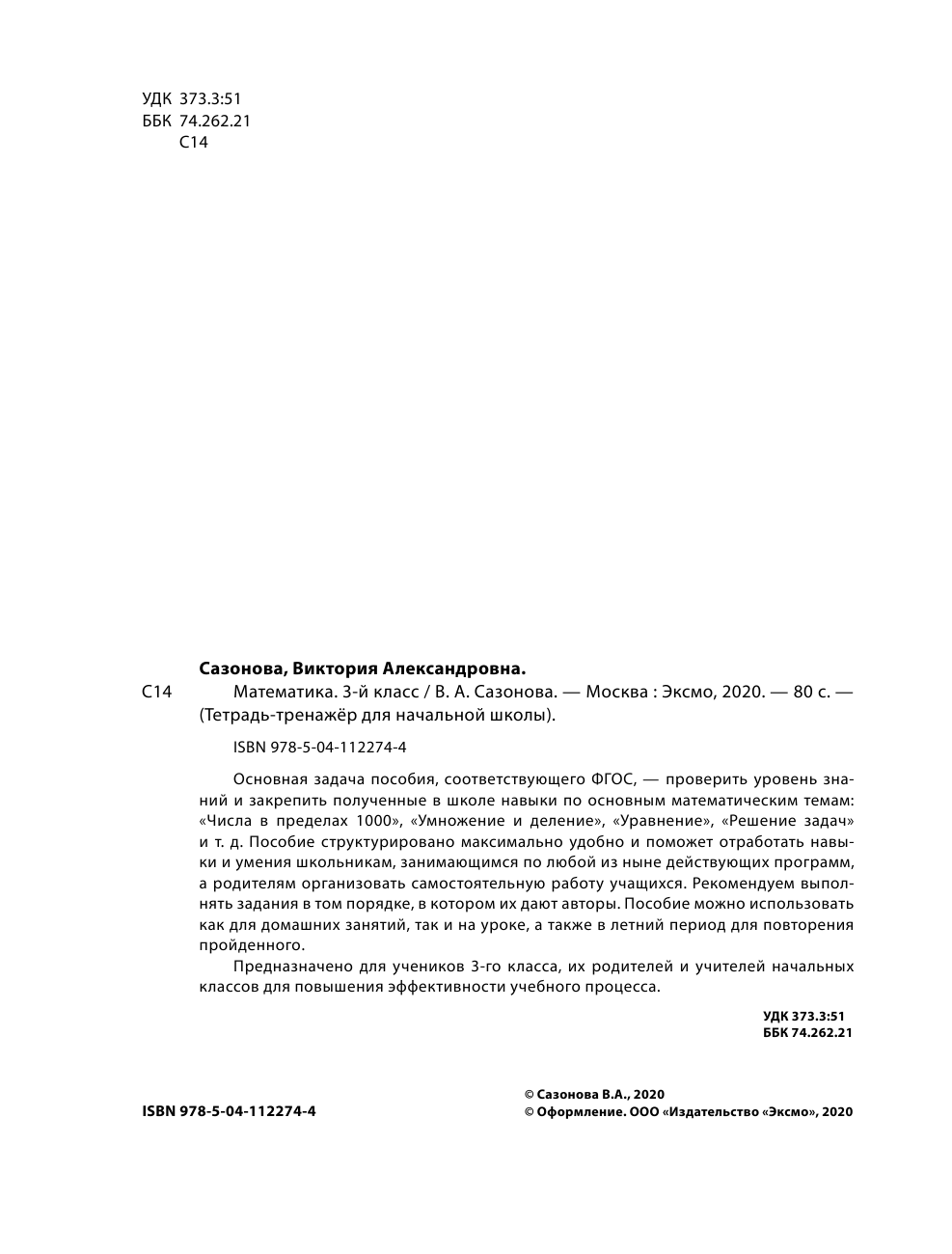 Книга: Математика. 3 класс (Сазонова Виктория Александровна); ООО "Издательство "Эксмо", 2020