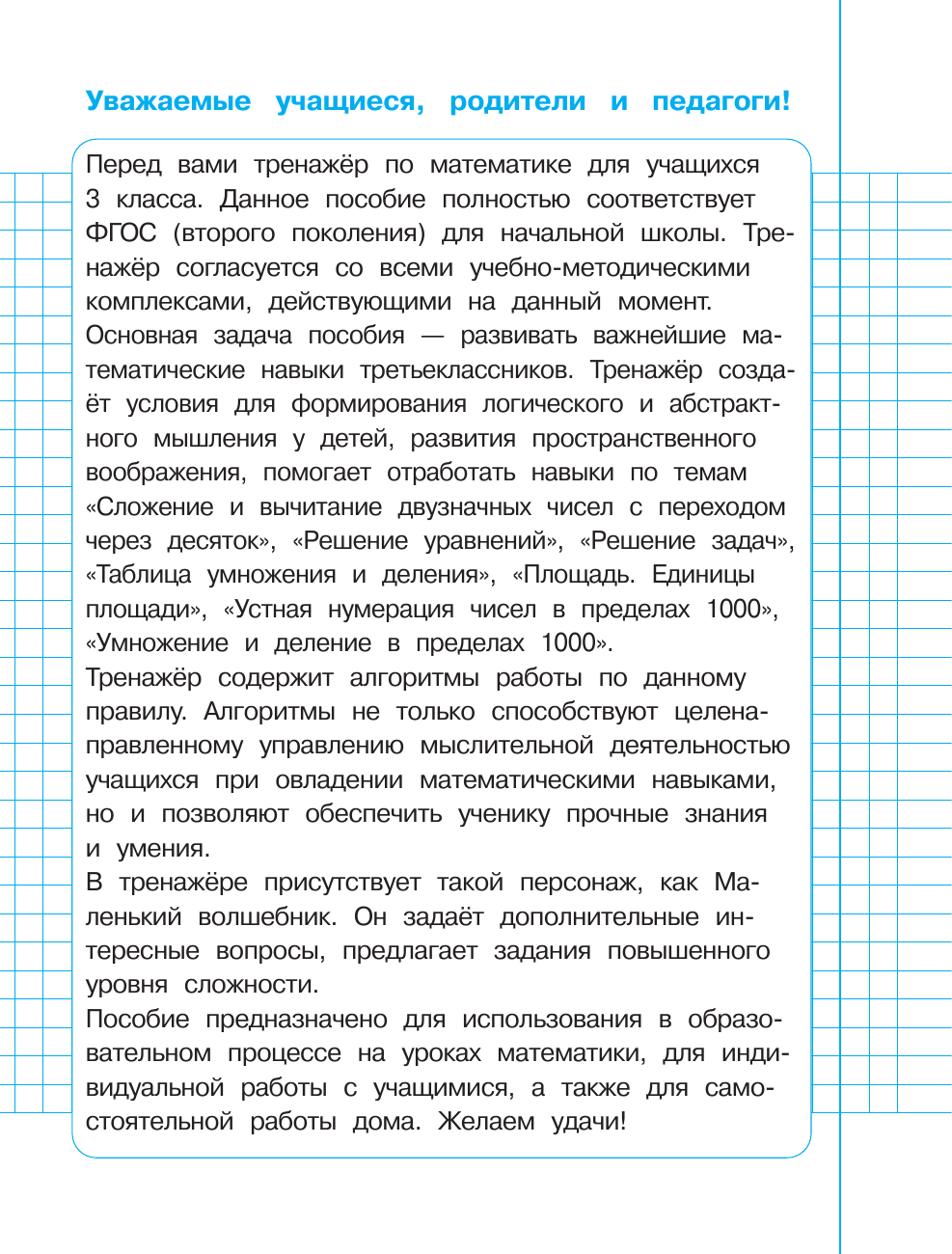 Основная задача пособия, соответствующего ФГОС --- проверить уровень знаний и закрепить полученные в школе навыки по основным математическим темам: "Числа в пределах 1000", "Умножение и деление", "Уравнение", "Решение задач" и т. д. Пособие структурировано максимально удобно и поможет отработать навыки и умения школьникам, занимающимся по любой из ныне действующих программ, а родителям организовать самостоятельную работу учащихся. Рекомендуем выполнять задания в том порядке, в котором их дают авторы. Пособие можно использовать, как для домашних занятий, так и на уроке, а также в летний период для повторения пройденного.