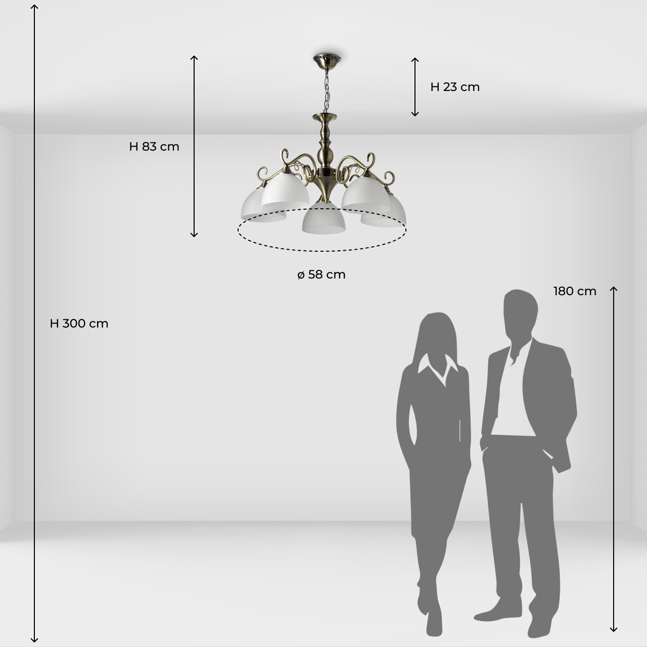 Подвесная люстра станет гармоничной деталью классического интерьера. Каркас изделия изготовлен из металла цвета античной бронзы и украшен множеством завитков. Светильник имеет 5 изогнутых рожков, увенчанных полузакрытыми плафонами из белого матового стекла, мягко рассеивающего свет. Плафоны выполнены в форме полусферы, декорированы рельефным рисунком в виде горизонтальных полосок. Подвес в виде цепи эффектно смотрится и позволяет регулировать люстру по высоте.