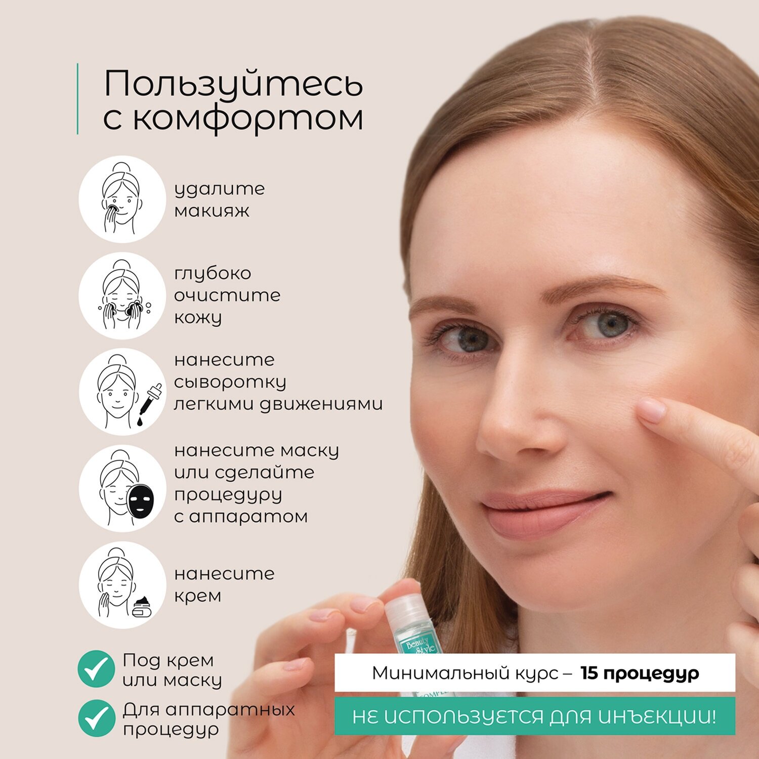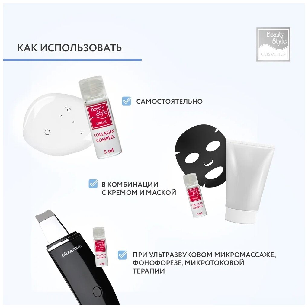 Активный сывороточный коллагеновый комплекс Beauty Style может применяться самостоятельно, в комбинации с кремом или нанесением косметических масок, а также при проведении процедур ультразвукового микромассажа и фонофореза, микротоковой терапии.