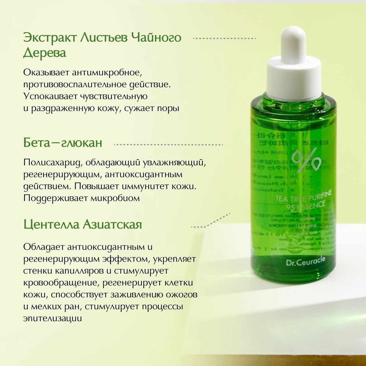 – Экстракт листьев чайного дерева в концентрации 95% успокаивает, ускоряет заживление, имеет противовоспалительный эффект