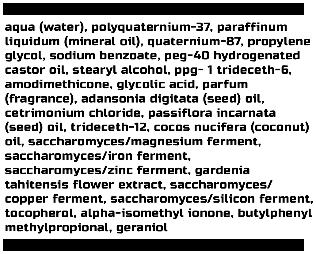 Состав: aqua (water), polyquaternium-37, paraffinum liquidum (mineral oil), quaternium-87, propylene glycol, sodium benzoate, peg-40 hydrogenated castor oil, stearyl alcohol, ppg-1 trideceth-6, amodimethicone, glycolic acid, parfum (fragrance), adansonia digitata (seed) oil, cetrimonium chloride, passiflora incarnata (seed) oil, trideceth-12, cocos nucifera (coconut) oil, saccharomyces/magnesium ferment, saccharomyces/iron ferment, saccharomyces/zinc ferment, gardenia tahitensis flower extract, saccharomyces/copper ferment, saccharomyces/silicon ferment, tocopherol, alpha-isomethyl ionone, butylphenyl methylpropional, geraniol