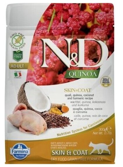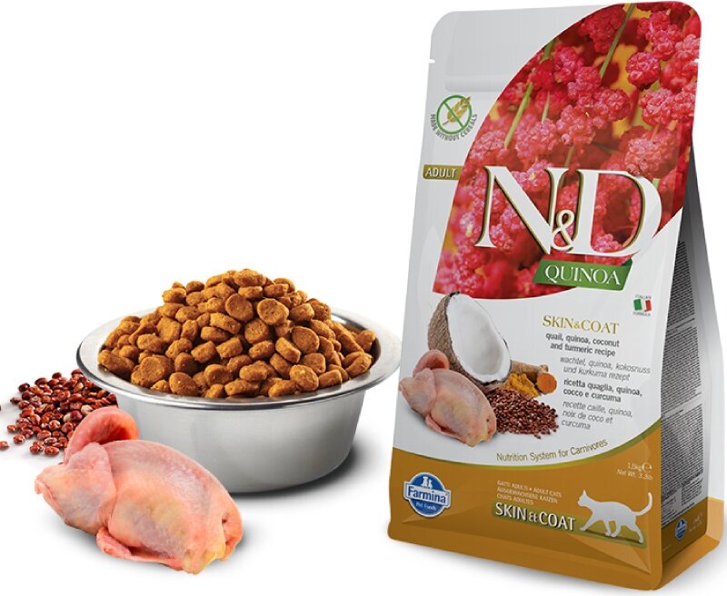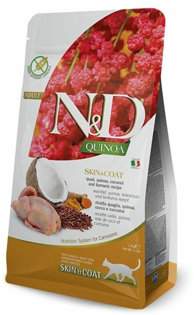 Farmina N&D Quinoa Skin & Coat беззерновой с перепелом и киноа. Беззерновой сухой корм Фармина с перепелом, киноа, кокосом и куркумой предназначен для взрослых кошек всех пород для здоровья кожи и шерсти. По ингредиентному составу относится к кормам класса холистик. Содержит все витамины и минеральные вещества необходимые для повседневного здорового питания вашего питомца.