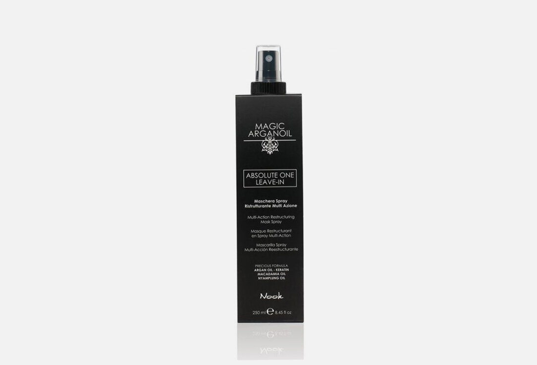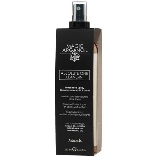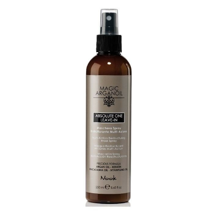 Концентрированная восстанавливающая маска-спрей "Магия Арганы" Absolute One Leave-In содержит натуральные масла арганы, макадмии, ниамплунг, которые в мгновение ока оживят и восстановят волосы, придав им восхитительную шелковистость и блеск, напитают и увлажнят по всей длине, от корней и до самых кончиков, распутают и предотвратят образование колтунов, смягчят без утяжеления, восстановят плотность, объём и гладкость, усилят и сохранят выбранный для имиджа цвет, при этом оставляя окрашенные и/или обработанные химией волосы живыми и привлекательными, послушными любой форме причёски, защитят в любое время года от неблагоприятного воздействия окружающей среды.