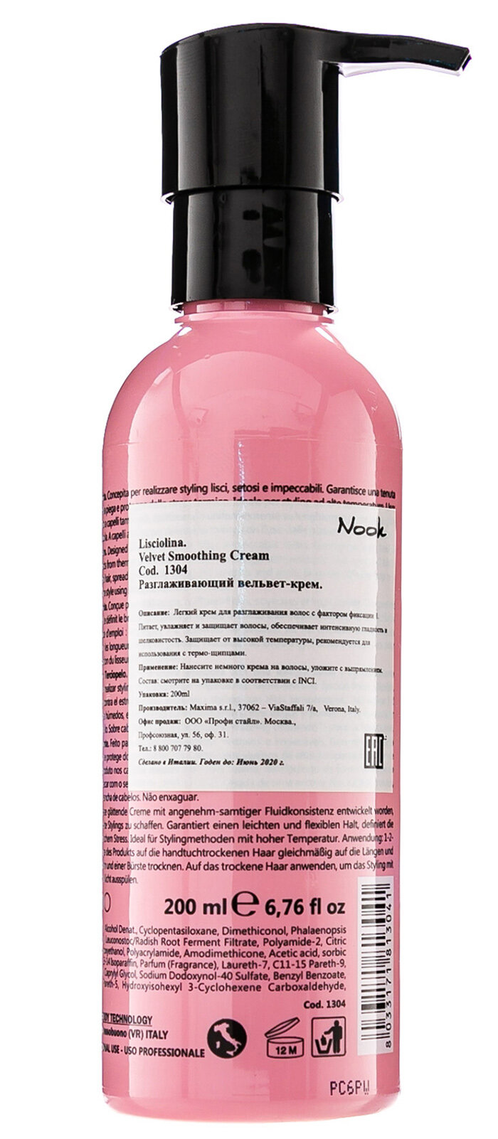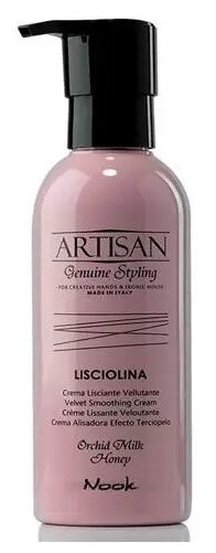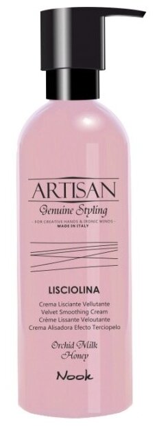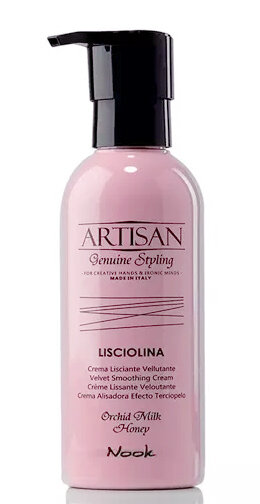 Разглаживающий вельвет-крем Artisan Lisciolina Velvet Smoothing Cream, представленный итальянским брендом Nook, обеспечивает контроль над степенью завивки кудрей, делает волосы послушными и эластичными, сохраняет насыщенность их цвета. Продукт ухаживает за локонами, питает их, гарантирует подвижную фиксацию и термозащиту. Крем имеет приятную бархатную текстуру, которая не утяжеляет пряди.