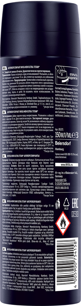 Дезодорант-антиперспирант спрей NIVEA MEN ULTRA Titan с антибактериальным эффектом препятствует размножению бактерий, вызывающих неприятный запах. Уникальная формула с черным углеродом эффективно действует против пота, сохраняет подмышки сухими и, таким образом, предотвращает неприятный запах тела. Антиперспирант обеспечивает надежную 48-часовую защиту от пота и запаха, заботясь о вашей коже. Аромат шалфей и пряный имбирь создан специально для мужчин. Антиперспирант не оставляет видимых следов на коже или одежде. Только ощущение сухой и чистой кожи в течение всего дня. Сильная защита и забота о коже от NIVEA на каждый день!