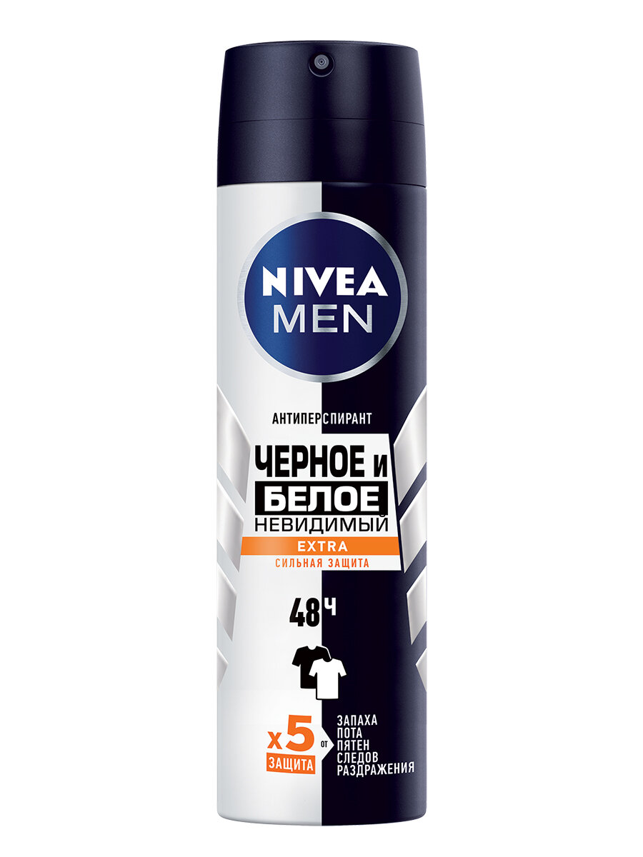 Антиперспирант "Черное и белое" Невидимый Extra не оставляет белых следов на черной одежде, предотвращает появление желтых пятен на белой одежде. Обеспечивает защиту от запаха на 48 часов. Не содержит этилового спирта. Не содержит озоноразрушающих веществ. Дерматологически протестировано.