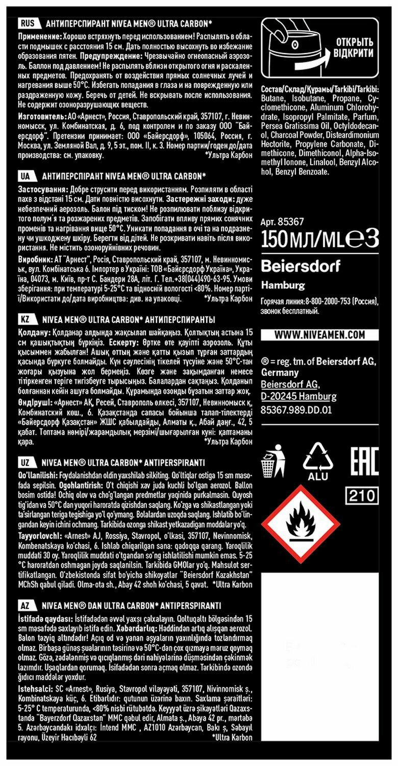 Дезодорант-антиперспирант спрей NIVEA MEN ULTRA Carbon с антибактериальным эффектом препятствует размножению бактерий, вызывающих неприятный запах. Уникальная формула с черным углеродом эффективно действует против пота, сохраняет подмышки сухими и, таким образом, предотвращает неприятный запах тела. Антиперспирант обеспечивает надежную 48-часовую защиту от пота и запаха, заботясь о вашей коже. Стойкий пряный древесный аромат создан специально для мужчин. Антиперспирант не оставляет видимых следов на коже или одежде. Только ощущение сухой и чистой кожи в течение всего дня. Сильная защита и забота о коже от NIVEA на каждый день!