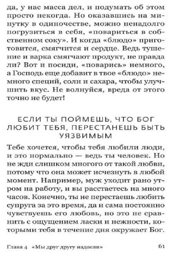 Книга написала с юмором и легко, причем о. Андрей избежал "популярных" православных штампов, типа "стерпится-слюбится", "терпи и смиряйся". Главное, что я усвоила из сборника: вера в Бога действительно делает многое в жизни проходимым, в том числе в семье и в отношениях. Это какой-то очень мощный стабилизатор.