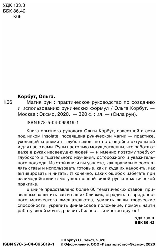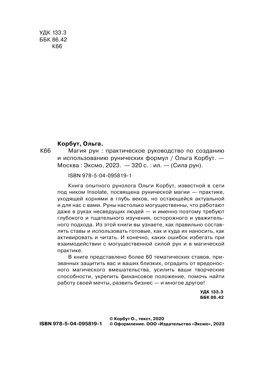 Книга опытного рунолога Ольги Корбут, известной в сети под ником Insolate, посвящена рунической магии - практике, уходящей корнями в глубь веков, но остающейся актуальной и для нас с вами. Руны настолько могущественны, что работают даже в руках несведущих людей - и именно поэтому требует глубокого и тщательного изучения, осторожного и уважительного подхода. Из этой книги вы узнаете, как правильно составлять ставы и использовать готовые, как и куда их наносить, активировать и читать. И конечно - каких ошибок избегать при взаимодействии с могущественной силой рун и в магической практике.
