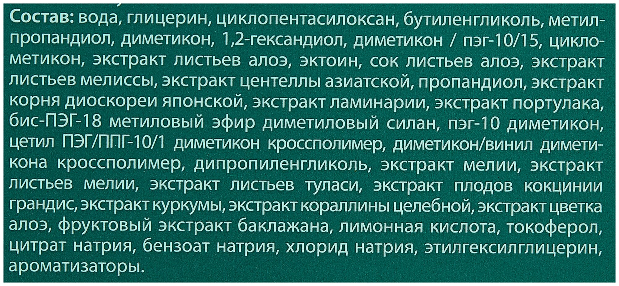 | Состав | water, glycerin, cyclopentasiloxane, butylene glycol, methylpropanediol, dimethicone, 1,2-hexanediol, dimethicone/peg-10/15 crosspolymer, cyclomethicone, aloe barbadensis leaf extract, ectoin, aloe barbadensis leaf juice, melissa officinalis leaf extract, centella asiatica extract, propanediol, dioscorea japonica root extract, laminaria japonica extract, portulaca oleracea extract, bis-peg-18 methyl ether dimethyl silane, peg-10 dimethicone, cetyl peg/ppg-10/1 dimethicone, peg-10 dimethicone crosspolymer |
