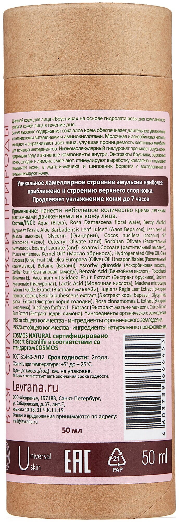 Дневной крем для лица Брусника на основе гидролата розы предназначен для комплексного ухода за кожей лица в течение дня.Основные активные ингредиенты:За счет высокого содержания сока алоэ крем обеспечивает длительное увлажнение и питание кожи витаминами и аминокислотами.Молочная и аскорбиновая кислоты очищают и выравнивают цвет лица, улучшая проницаемость клеточных мембран для активных ингредиентов.Низкомолекулярный гиалуронат проникает вглубь кожи, удерживая воду и активные компоненты внутри.Экстракты брусники, березовых почек, солодки и лимона смягчают, стимулируют выработку коллагена и повышают иммунитет кожи.Мать-и-мачеха и шиповник борются с воспалениями и витаминизируют кожу.Крем Брусника представляет собой ламеллярную эмульсию. Эта структура наиболее приближена к строению верхнего слоя кожи, что увеличивает эффективность воздействия крема и способствует поддержанию гидробаланса в клетках до 7 часов. Рекомендуется наносить не менее чем за 30 минут до выхода на улицу.