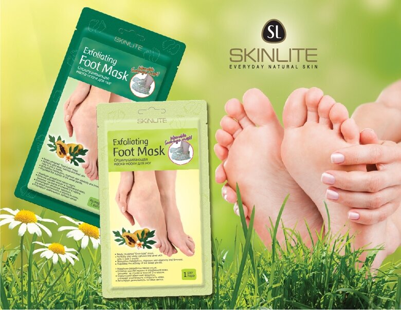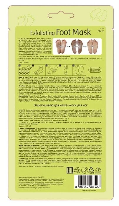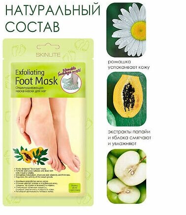 Описание товара:Skinlite отшелушивающая маска-носки для ног - это инновационный продукт, который сочетает в себе глубокий пилинг стоп и долговременный оздоравливающий эффект. Это эффективное средство для удаления мозолей, натоптышей и потрескавшейся кожи на стопах, предотвращающее огрубление кожи и образование новых трещин. Гликолевая и цитрусовая кислоты способствуют безболезненному и естественному удалению отмерших клеток. Натуральные экстракты папайи и яблока оказывают смягчающее, увлажняющее и восстанавливающее действие. Экстракт ромашки успокаивает кожу.Состав товара:Вода, пропилен гликоль, спирт, молочная кислота, изопропиловый спирт, мочевина, гликолевая кислота, бетаин, PEG 60 гидрогенизированное касторовое масло, салициловая кислота, триклинен, ментол, двунатриевая ЭДТА, экстракт яблока (PYRUS MALUS), экстракт лимона (CITRUS MEDICA LIMONIUM), экстракт апельсина (CITRUS AURANTIUM DULCIS), экстракт папайи (CARICA PAPAYA), экстракт ромашки римской (ANTHEMIS NOBILIS), ароматизатор.Меры предосторожности:Не использовать маску, если на ногах есть открытые раны, порезы, раздражения, экзема или кожа склонна к аллергии. Не использовать продукт, если есть чувствительность к какому-либо из компонентов состава. Если в процессе применения на коже появляется раздражение, покраснение прекратить использование и обратиться к врачу. Перед использованием, во избежание аллергических реакций, нанести небольшое количество маски на небольшой участок кожи, чтобы проверить реакцию. Использовать только для ног! Не глотать. Избегать попадания на слизистую оболочку глаз. В случае попадания - тщательно промыть водой. Хранить в месте, недоступном для детей. Избегать попадания прямых солнечных лучей и воздействия слишком высоких или низких температур.Способ применения:Перед использованием помойте ноги теплой водой. Откройте упаковку и наденьте маску-носки. Через 90 минут снимите маску-носки. Остатки маски смойте теплой водой. Огрубевшая кожа начнет отслаиваться на 4-7 день после использования маски. После применения отшелушивающей маски рекомендуется регулярно использовать SKINLITE Интенсивно-восстанавливающую маску-носки для ног "Абрикос".