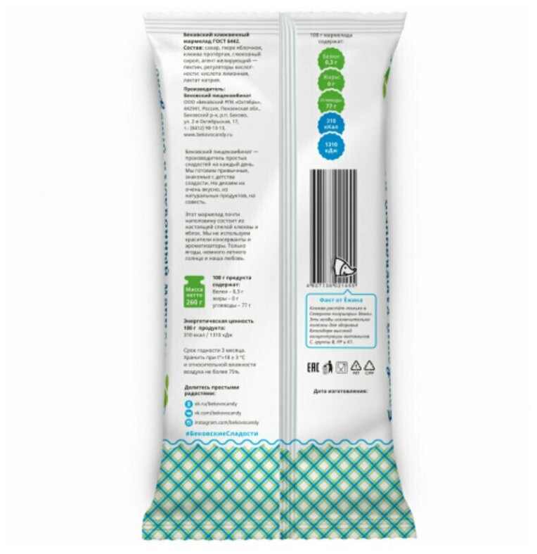 | Состав | сахар, пюре яблочное, клюква протертая, глюкозный сироп, агент желирующий |