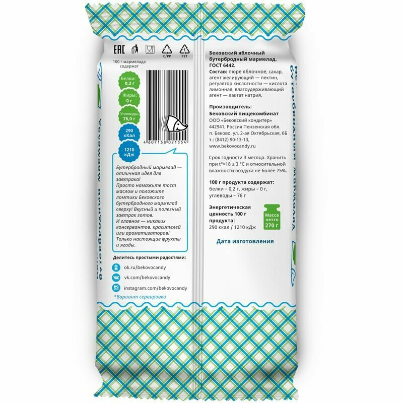 Яблочный мармелад-отличная идея для завтрака! Просто намажьте тост маслом и положите ломтики яблочного мармелада сверху! Вуаля! Вкусный и полезный завтрак готов. Наш бутербродный мармелад уже порезан на ломтики для вашего удобства. И главное-никаких консервантов, красителей или ароматизаторов! Только настоящие яблоки! Мармелад-замечательные вкусы и яркие цвета без вреда для здоровья. Наш мармелад приготовлен с использованием исключительно натуральных красителей и натуральных ароматизаторов. Отличный выбор для тех, кто хочет порадовать своих детей вкусными и безопасными сладостями! Бековский яблочный мармелад-самая простая и натуральная сладость! Вы только прочтите состав! В составе яблочного мармелада-настоящие яблоки. Именно благодаря пюре из сочных и ароматных яблок мармелад приобретает натуральный коричневый цвет. В нём нет ароматизаторов, красителей или консервантов.