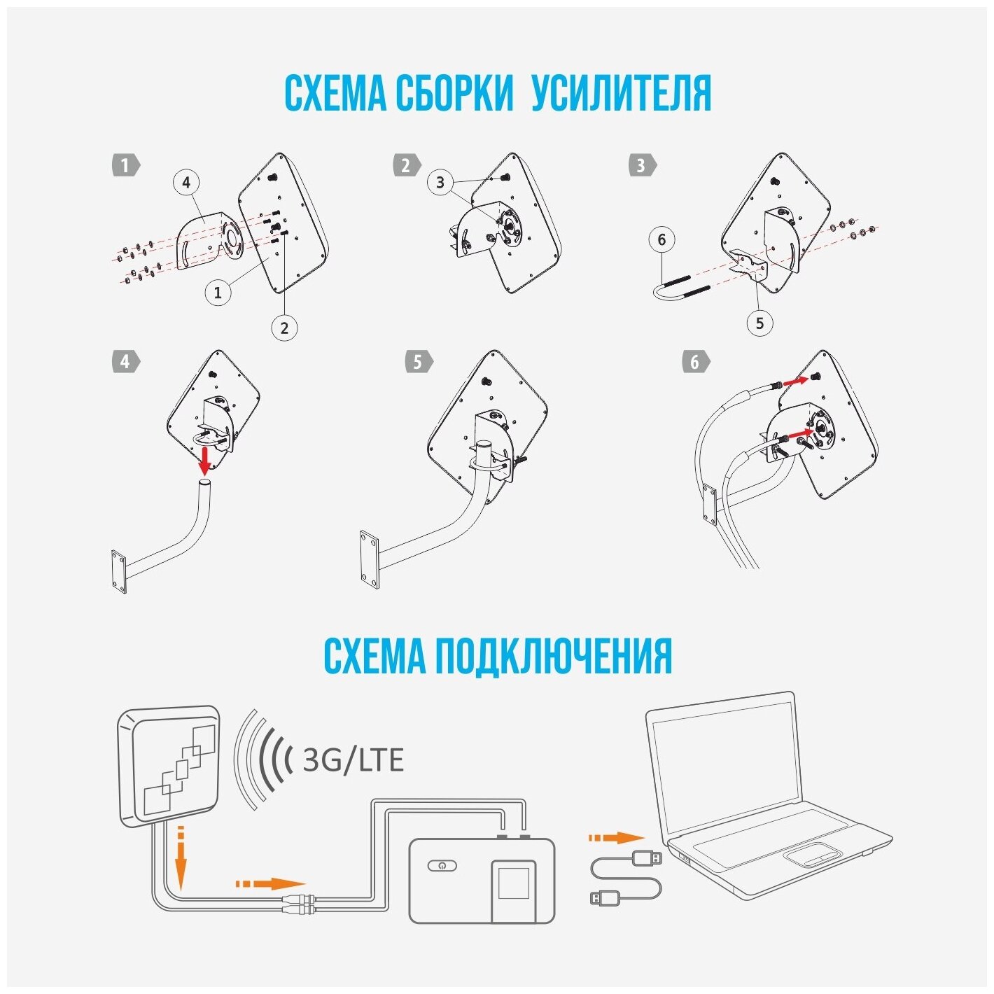 Усилитель интернет сигнала 4G/LTE позволяет получить доступ в Интернет в условиях отсутствия проводного интернета. Может применяться на даче, в загородном доме, мотеле, турбазе, АЗС и в любом другом месте. В комплект входят наружная панельная 4G/LTE антенна с поддержкой технологии MIMO, крепление, два коаксиальных кабеля с разъемами F-типа, и два комплекта переходников F/CRC9 и F/TS9 для подключения антенны к большинству известных абонентских устройств, таких как USB модемы, роутеры и т.д. Рабочий диапазон частот 1700-2700 МГц.