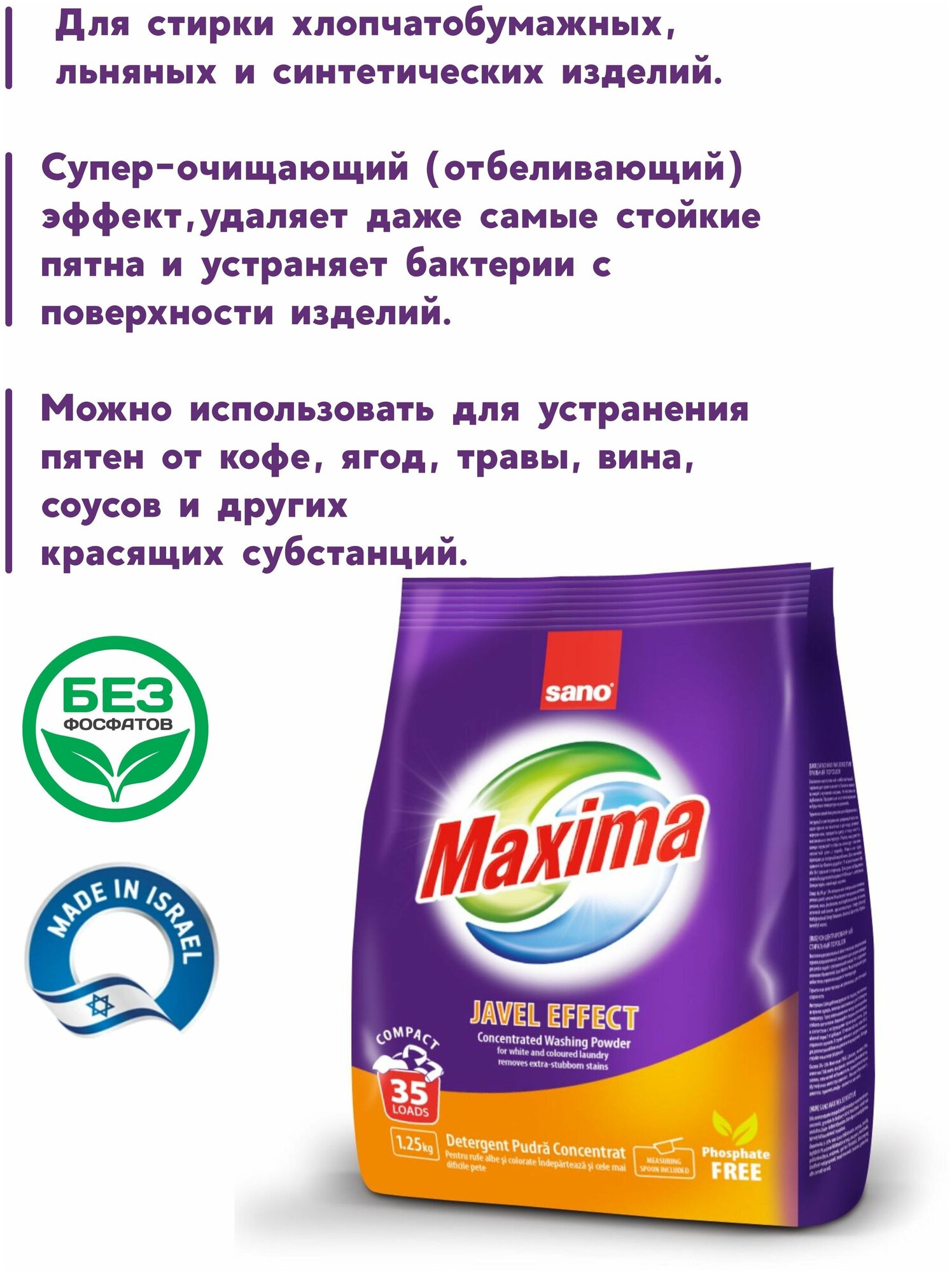 Концентрированный стиральный порошок Sano Maxima Javel пригодный для стирки во всех типах стиральных машин, при различной температуре хлопчатобумажных, льняных и синтетических тканей. Идеально подходит для стирки особенно в жесткой воде, так как он включает в себя компоненты, которые предотвращают возникновение накипи и известкового налета. Предназначен для особо загрязненных цветных тканей. Порошок Sano Maxima Javel способствует эффективному удалению пятен от кофе, чая, вина, фруктов, травы, соусов и т. п. Для эффективного выведения пятен желательно стирать при максимально допустимой температуре с большим количеством порошка на программу замачивания стирки. Порошок особенно эффективен для свежих пятен. Учтите, что не все пятна выводятся. Sano Maxima Javel - это порошок для идеального гигиенической стирки, уничтожения микробов и придания нежного аромата белью. Инструкции по применению: Прочитайте инструкцию по стирке на вещах, которые нужно постирать. Обратите внимание на максимальную температуру стирки. Проверьте устойчивость цвета на незаметной части ткани. На 5 кг обычной стирки возьмите 1/3 мерного стакана (66 мл или 36 гр). В случае более загрязненного белья увеличьте количество порошка до 2/3 мерного стакана (130 мл или 72 гр). В случае особо грязного белья увеличьте количество порошка до полного мерного стакана предварительно обработав пятна. Рекомендации интернет-магазина RightOn: Не перегружайте стиральную машину. Отделите цветное белье от белого. Новые вещи в первый раз желательно стирать отдельно. Израиль