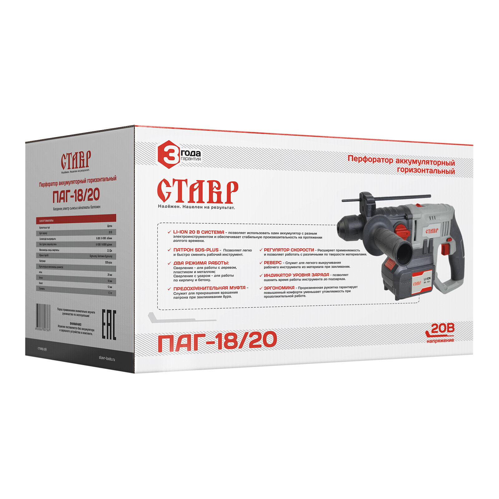 Аккумуляторный перфоратор SDS-plus Ставр ПАГ-18/20 применяется для сверления отверстий в ударном и безударном режимах в таких материалах, как кирпич, камень, бетон, дерево, пластик, металл и прочих. Изделие имеет бытовое назначение. Товар поставляется без аккумулятора и зарядного устройства.Преимущества LI-ION 20 В система - позволяет использовать один аккумулятор с разным электроинструментом и обеспечивает стабильную производительность на протяжении долгого времени Индикатор уровня заряда - позволяет оценить время работы инструмента до подзаряда Патрон SDS-PLUS- позволяет легко и быстро сменить рабочий инструмент Два режима работы:сверление- для работы с деревом, пластиком и металлом;сверление с ударом- для работы по кирпичу и бетону Регулятор скорости - расширяет применяемость и позволяет работать с различными по твердости материалами Реверс - служит для легкого выкручивания рабочего инструмента из материала при заклинивании Предохранительная муфта - служит для прекращения вращения патрона при заклинивании бура Эргономика - прорезиненная рукоятка гарантирует повышенный комфорт и уменьшает утомляемость при продолжительной работе