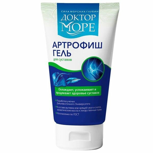 Гель на основе вытяжки из акулы и ската, ароматических масел и лекартственных трав с охлаждающим эффектом Способствует быстрому снижению воспаления и боли в суставах Улучшает подвижность суставов Рекомендован в комплексной терапии заболеваний суставов АРТРОФИШ ГЕЛЬ - уникальная разработка ученых "Доктор Море". Полностью натуральный продукт на основе вытяжки из акулы и ската, с добавлением ароматических трав: ментола и мяты, а так же масла жожоба, плюща, иглицы и эвкалипта. Ментол и мята мгновенно охлаждают кожу и дарят ощущение комфорта. Хрящ полярной акулы и хондроитин питают кожу, улучшают подвижность суставов, стимулируют выработку внутрисуставной жидкости. Масла жожоба, плюща, иглицы и эвкалипта оказывают противовоспалительное действие, снимают покраснение кожи, успокаивают боль в суставах и приносят долгожданное облегчение.