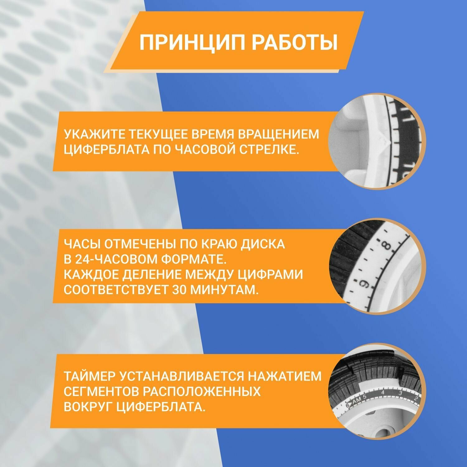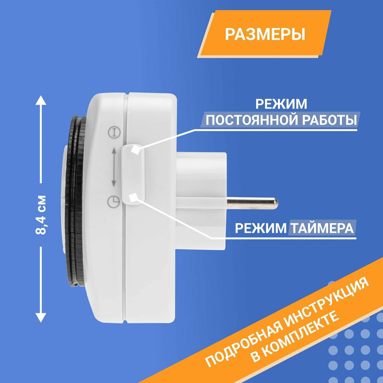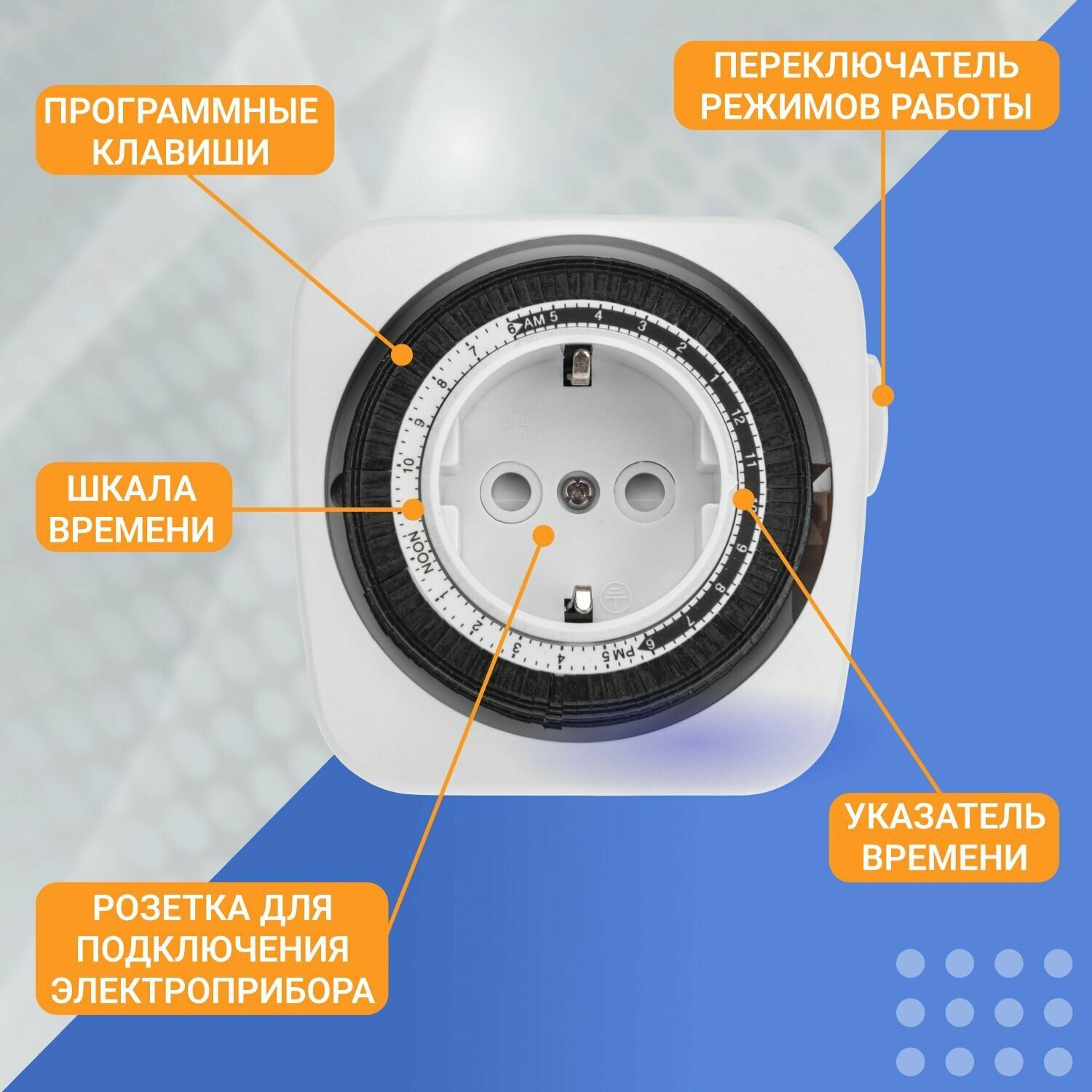 Розетка REXANT с механическим таймером позволяет настраивать время работы приборов в ближайшие сутки. Например, уходя на работу утром, Вы можете запланировать на вечер включение электрического отопления, освещения, бойлера и т.д. Программа задается вручную, шаг таймера 15 минут.