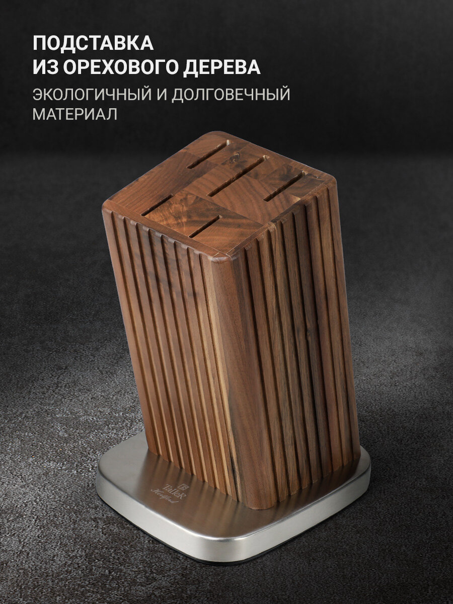 Ножи отлично сбалансированы и удобно ложатся в руку. Режущая кромка лезвия ножа устойчива к притуплению, рукоятки ножей выполнены из коррозионностойкой стали, а подставка выполнена из благородной древесины грецкого ореха и нержавеющей стали.