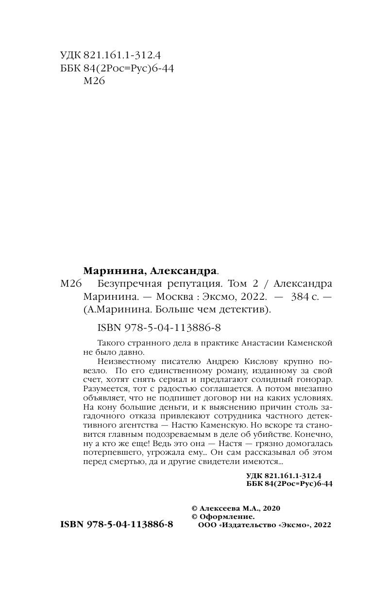 Безупречная репутация. Том 2 (Александра Борисовна Маринина); Эксмо, 2022