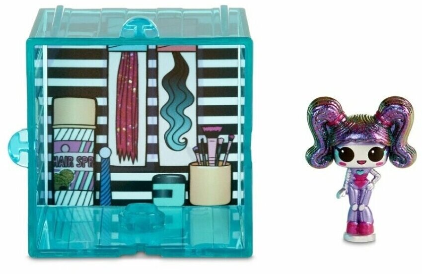 Каждая мини-куколка прячется в разноцветном прозрачном кубе, внутри которого интересный яркий фон, 5 аксессуаров и деталь для сборки мини-глэмпера. Прически мини-куколок взаимозаменяемые.