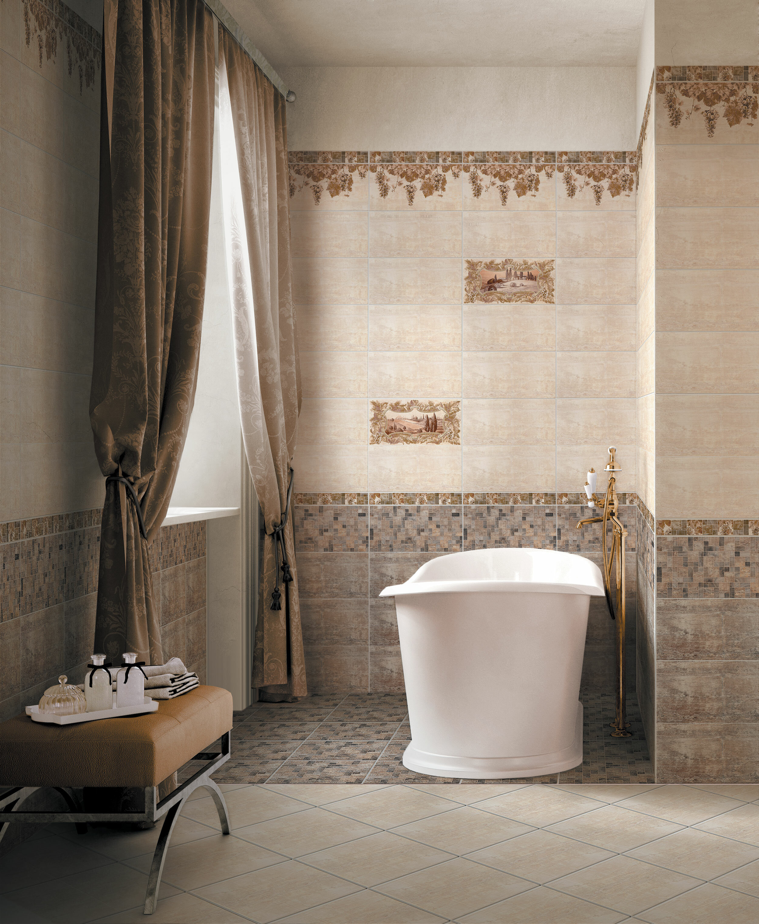 Название линейки - Тоскана, что отражено в декоративных элементах. На некоторых плитках изображены умиротворяющие пейзажи этой местности, как будто сошедшие со страниц старых фолиантов. Стилизация - под неяркий натуральный камень.
