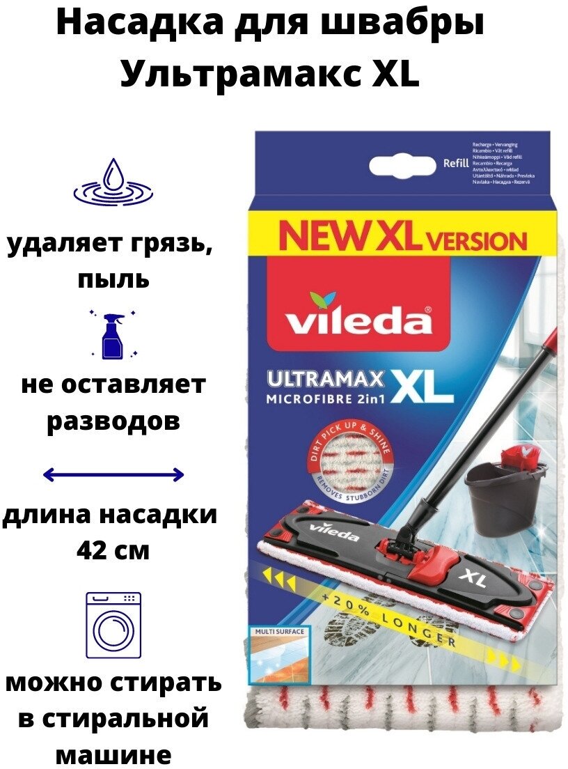 Сменная насадка Vileda Ультрамакс XL предназначена для мытья всех типов напольных покрытий, в том числе паркета и ламината. Насадку можно стирать в машинке при температуре до 60°. НЕ использовать кондиционер!