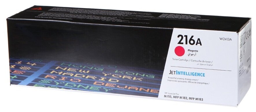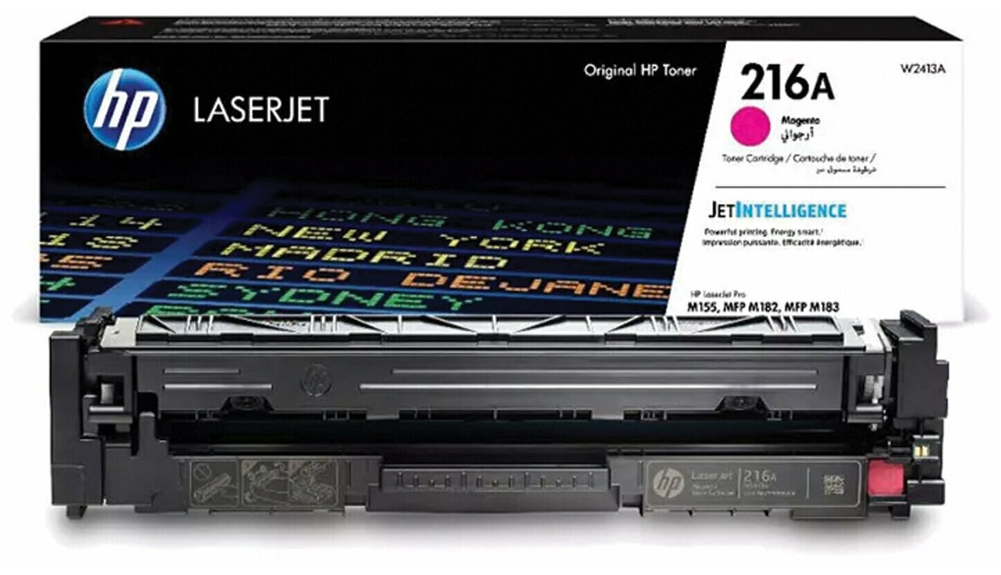Оригинальный лазерный картридж HP 216A W2413A пурпурного цвета. Ресурс — 850 страниц. Для лазерных принтеров и МФУ HP: LaserJet Pro MFP M182/M183.
