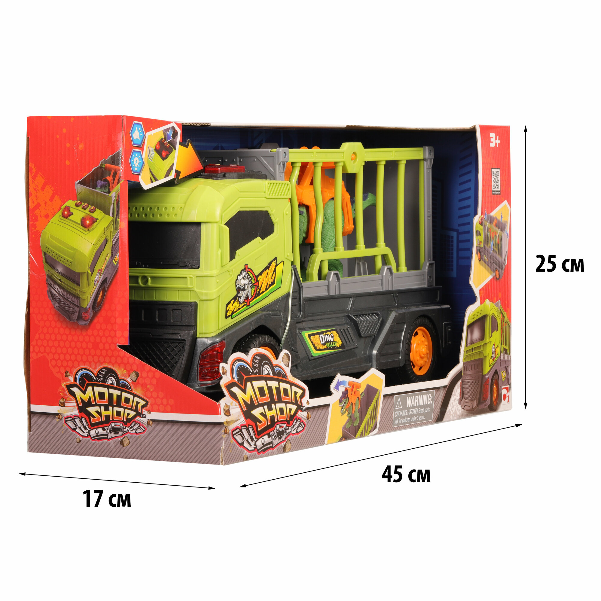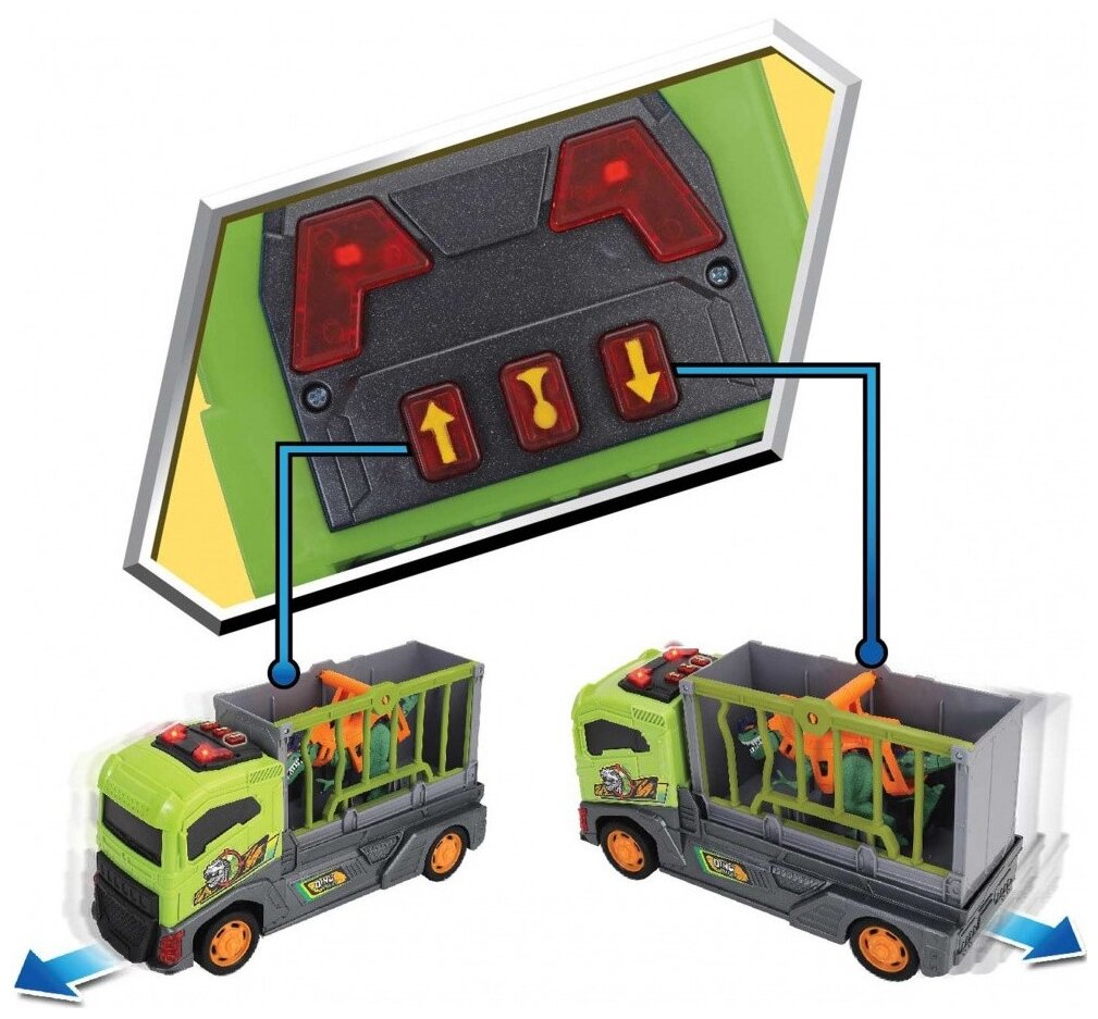 В набор входит моторизированный грузовик с фигуркой акулы 20 см. Грузовик оснащен задним приводом имеет звуковые, световые функции. На кабине грузового транспорта расположены кнопки управления. 2 режима передвижения- это движение вперед, назад, а также кнопка подачи звука работы двигателя. При включении любого режима передвижения грузовика, кузов с хищником начинает вибрировать.