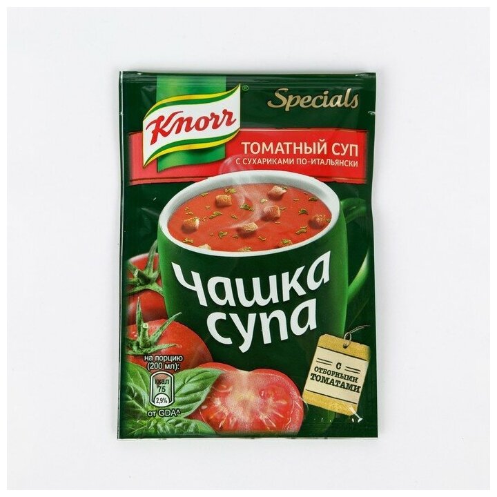 На сегодняшний день товар «Чашка супа Knorr "Томатный суп с сухариками по-итальянски" 18гр (67990253)» можно купить с кешбеком в 1 магазине: Яндекс.Маркет