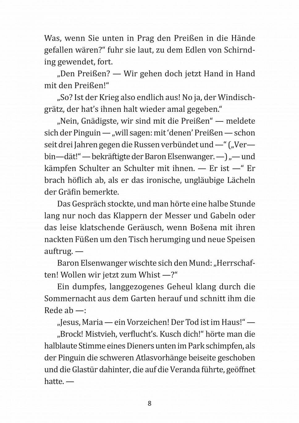 Действие романа «Вальпургиева ночь» (1917) разворачивается в Чехии. Прага становится местом столкновений немецких бюрократов, находящихся в осаде в старинном замке над рекой Влтава, и чешских революционеров, занявших город внизу. История, миф и политическая реальность переплетаются в эпизоде, когда восставшие штурмуют замок, чтобы короновать бедного скрипача, «Императора мира».