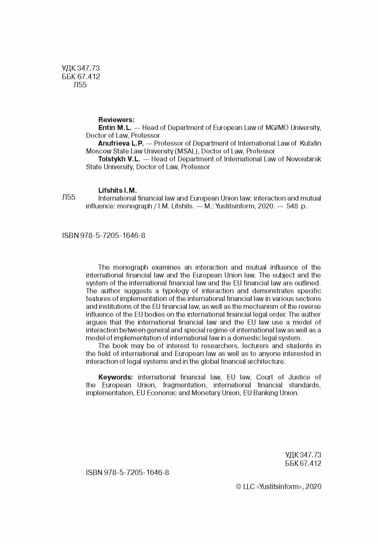 Международное финансовое право и право Европейского союза: взаимодействие и взаимовлияние (Илья Михайлович Лифшиц); Юстицинформ, 2020