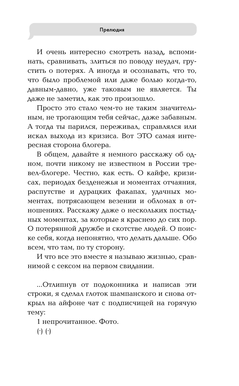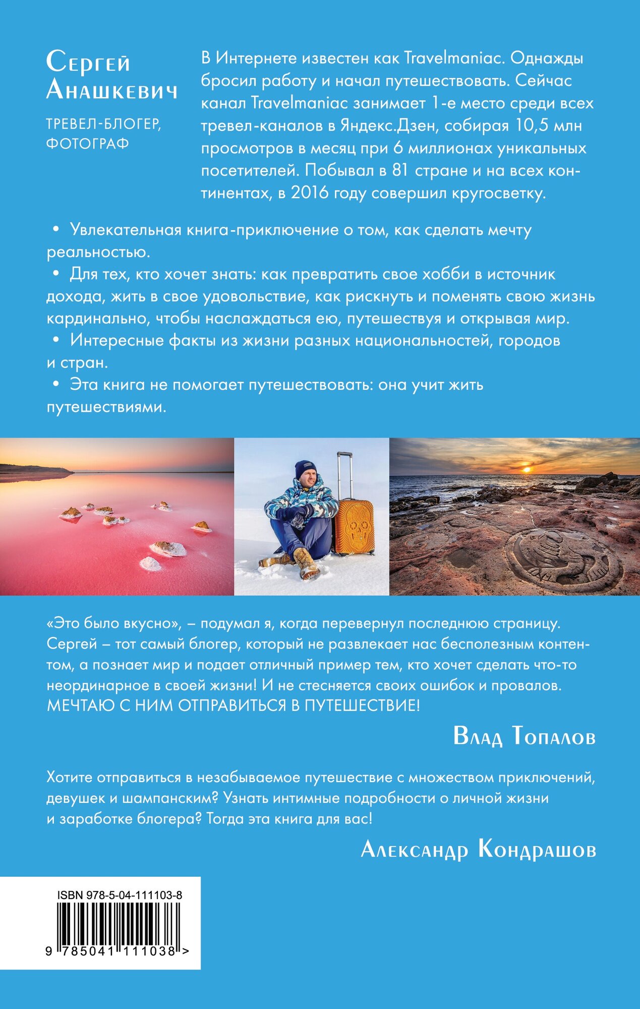 История об обычном человеке, который однажды бросил работу и начал путешествовать, отличается от многих других похожих книг: рассказ Сергея Анашкевича не про экономные путешествия, хитрости с лайфхаками или способы подзаработать, чтобы путешествовать. История Сергея о другом - как путешествовать полноценно и комфортно, как научиться зарабатывать путешествиями, а не наоборот. И как все это делать с искренним кайфом. Путь блогера здесь плотно сплетается с романтикой путешествий, когда тяга к странствованиям побеждает и деньги, и отношения, и любовь.