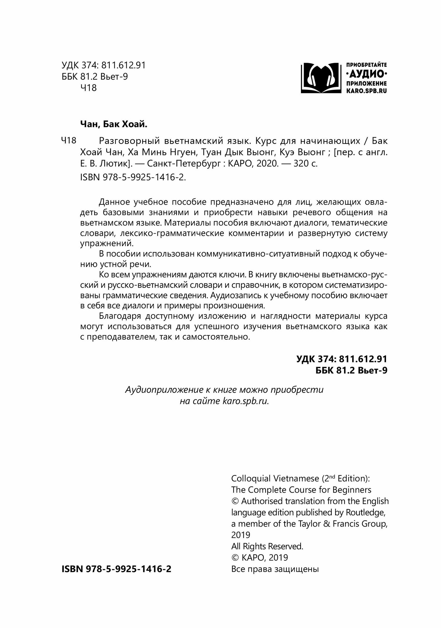 Ко всем упражнениям даются ключи. В книгу включены вьетнамско-русский и русско-вьетнамский словари и справочник, в котором систематизированы грамматические сведения. Аудиозапись к учебному пособию (не входит в комплект) включает в себя все диалоги и примеры произношения.